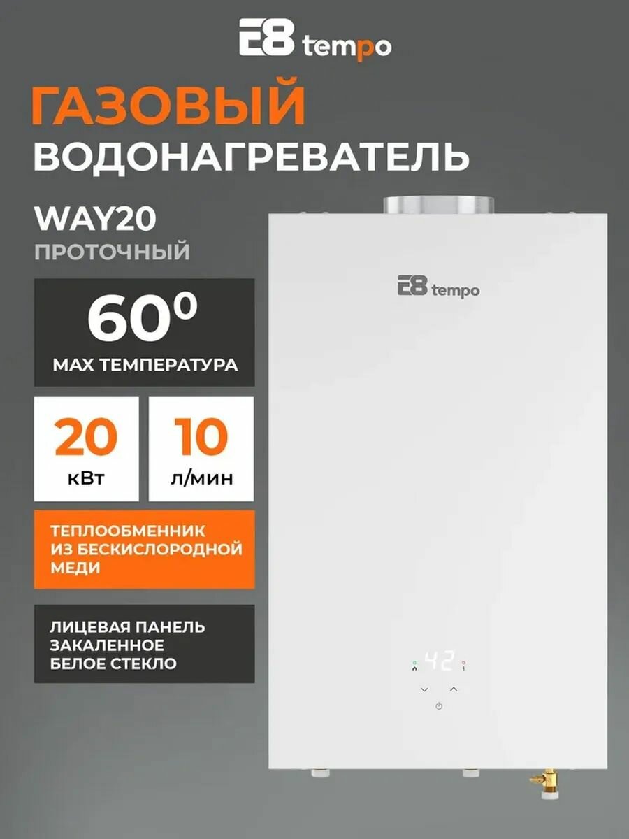 Цифровая газовая колонка E8 Tempo, модель WAY20 (питание от сети 220В без батареек, лицевая панель закаленное стекло белого цвета, 10 л/мин, 20 кВт, дымоход 110 мм, природный газ): сравнение цен, характеристики, фото, актуальное наличие и цены.