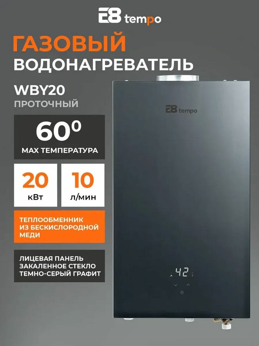 Цифровая газовая колонка E8 Tempo, модель WBY20 (питание от сети 220В без батареек, лицевая панель закаленное стекло цвета темно-серый графит, 10 л/мин, 20 кВт, дымоход 110 мм, природный газ): сравнение цен, характеристики, фото, актуальное наличие и цены.