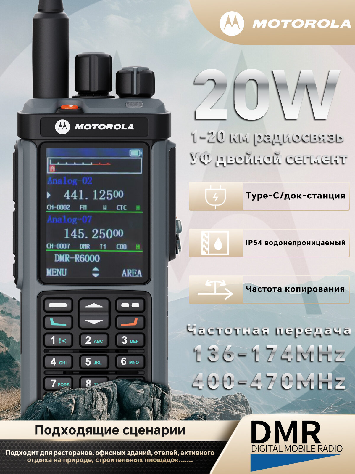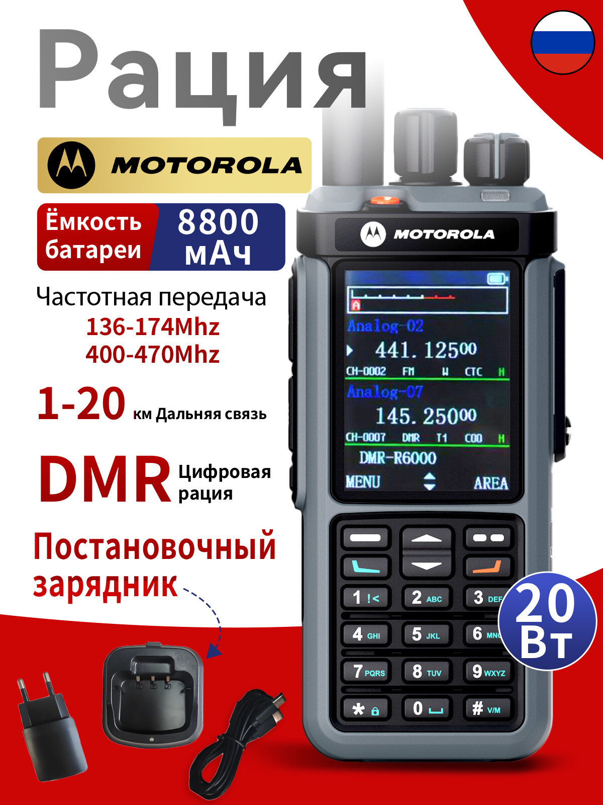 Цифровая рация MOTOROLA DP4801E: зарядная станция 20 Вт, батарея 8800 мА·ч, защита IP54, дальность передачи 20 км: сравнение цен, характеристики, фото, актуальное наличие и цены.
