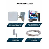 Цифровая Приставка DVB-T2 Selenga HD 980D ( Пульт с батарейками, адаптер питания, кабели RCA ); Уличная антенна для цифрового ТВ, DVB-T2, активная 30дБ; Кабельная сборка 10 метров; Кронштейн
