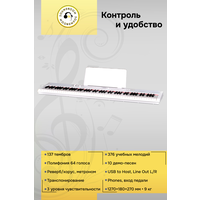 Отзывчивость на прикосновение и клавиатура с 88 полноразмерными клавишами придают ощущение игры на акустическом пианино. Продвинутый дизайн механики обеспечивает динамичный отклик и плавную игру. Также предусмотрена возможность регулировки чувствительности клавиш для максимального комфорта.