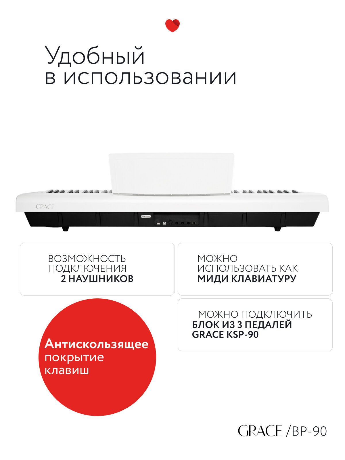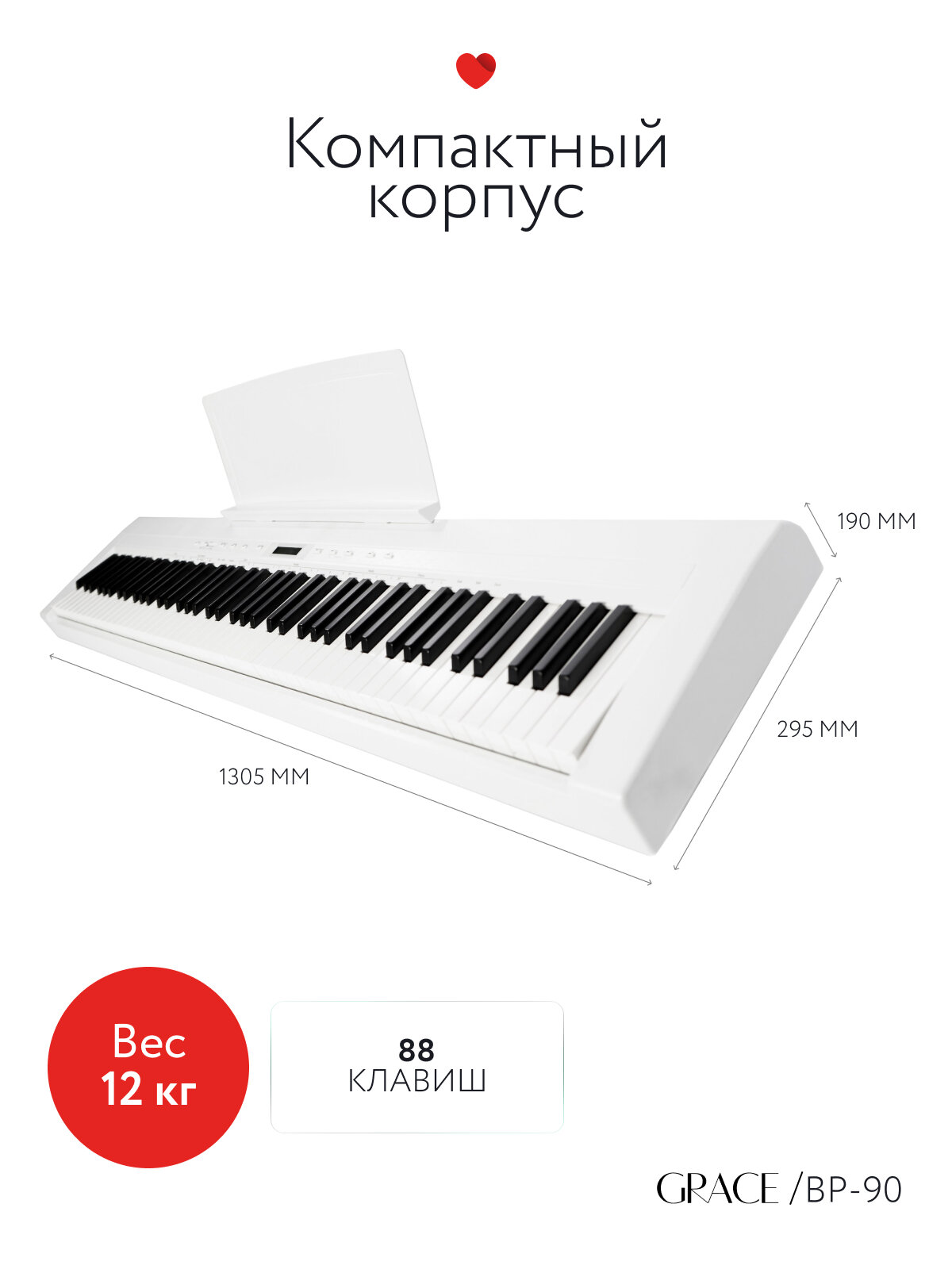 Grace BP-90 - самое доступное пианино с молоточковой клавиатурой, подходящей для музыкальной школы. Несмотря на цену, BP-90 при этом имеет богатый набор функций и высокое качество сборки. Динамики 50 Ватт, как на более взрослых моделях, полифония 81 голос, функция автоаккомпанемента.