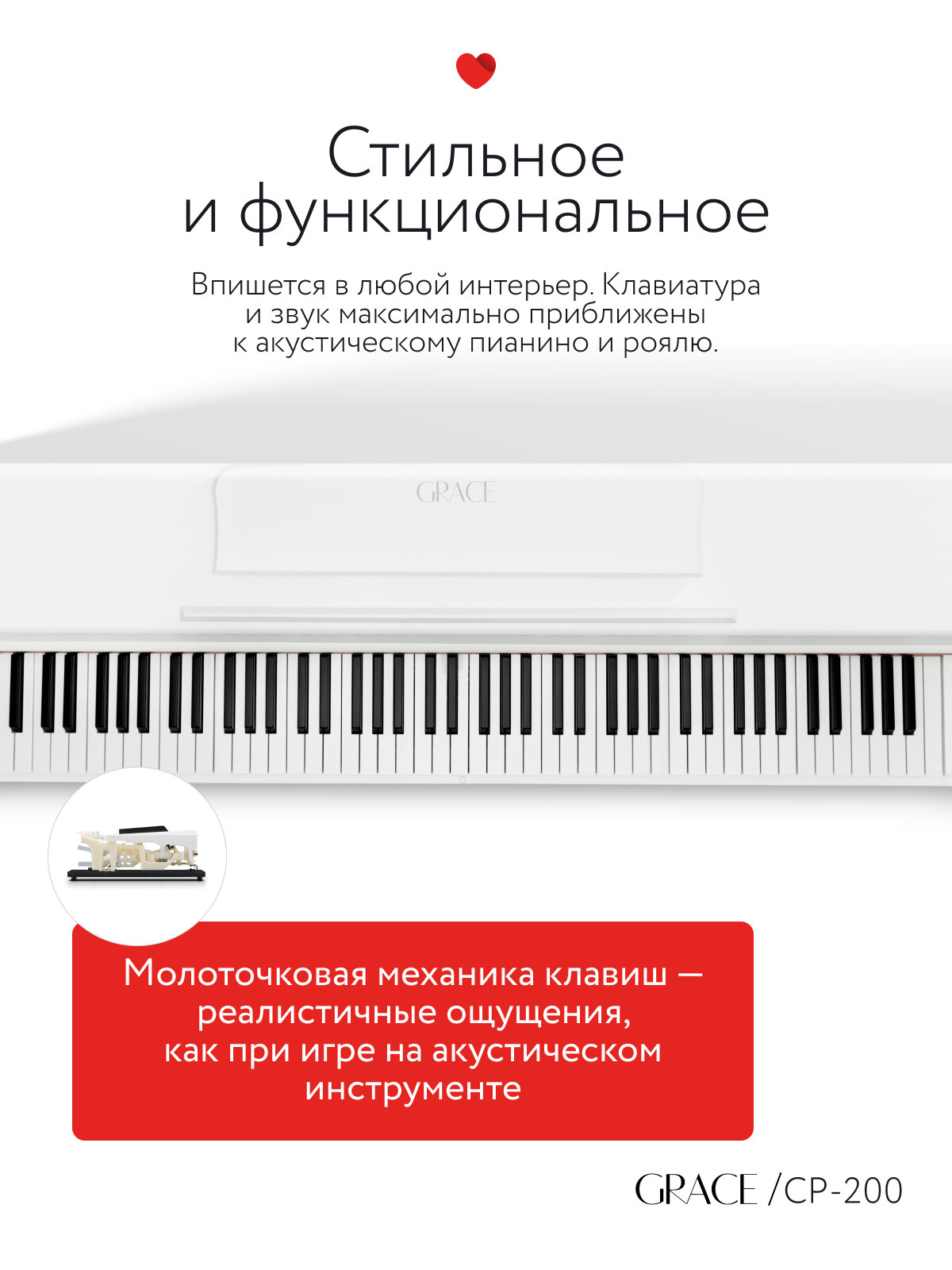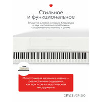 Цифровое пианино Grace CP-200 отличается утончённым дизайном и предназначен как замена акустическому пианино и роялю. CP-200 имеет полифонию в 189 голосов, что позволяет играть сложные произведения без потери качества звучания. CP-200 воспроизводит богатый тембр рояля с легендарного концертного рояля Steinway, на каждую клавишу записано 5 звуковых дорожек. В зависимости от силы нажатия вопроизводятся разные сэмплы, что в результате дает неотличимый от легендарного рояля звук. Мощный 8-ядерный процессор и динамики в 50 Ватт позволяют обрабатывать и выдавать повторимое концертному роялю качество. Этот инструмент оптимален для музыкантов с опытом, ценящих аутентичность игры на акустическом пианино, и идеален для учащихся музыкальных школ.