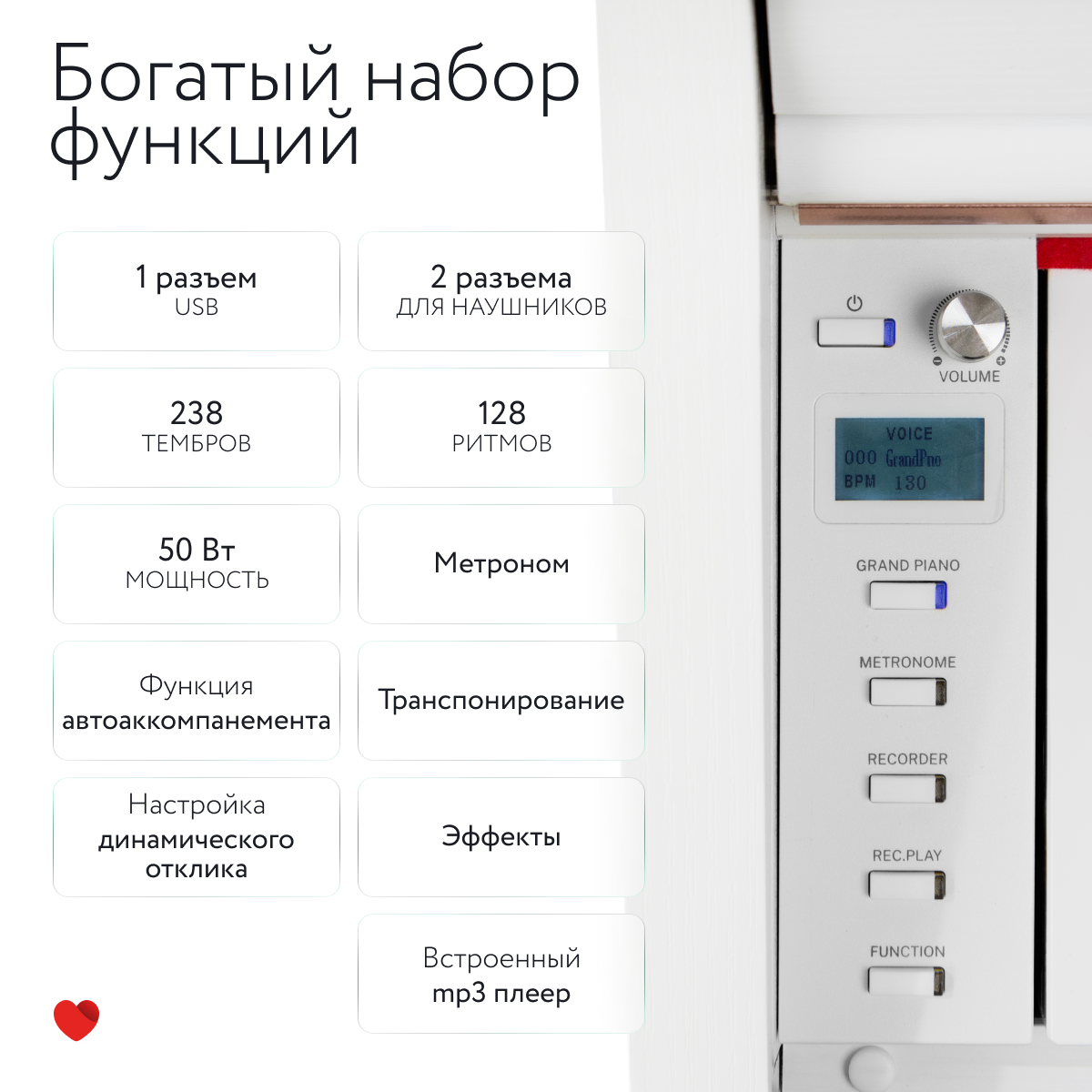 Grace CP-250 Цифровое пианино высокого класса за относительно небольшой бюджет. За счет мощного 8-ядерного процессора с полифонией в 189 голосов, и ТОПовой клавиатуры, пианино "осилит" произведения любого уровня без ограничений. Мощные динамики в 50 Ватт позволят выдавать качественный звук с проработанными нижними и верхними частотами.