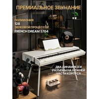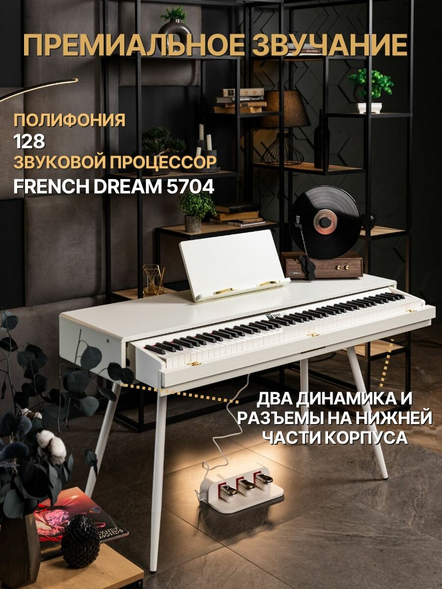 Цифровое пианино "MusicHall Grazioso" - это изысканный инструмент, который станет не просто источником музыки, но и изысканным акцентом в вашем интерьере. Лаконичные формы, элегантные конические ножки и изысканный белый цвет фортепиано создают атмосферу уюта и вдохновения. Технология French Dream 5704 обеспечивает богатое, теплое и выразительное звучание, близкое к звуку акустического рояля. 88 полноразмерных молоточковых клавиш обеспечивают максимальный контроль над динамикой и выразительностью исполнения. Подключите наушники (2 разъема!) для комфортных занятий в любое время суток, USB-порт для записи и обмена данными, разъем для подключения 3-х педалей (в комплекте!) для полного контроля над выразительностью, а также AUDIO OUTPUT и AUDIO INPUT для подключения к аудиосистеме или другим устройствам. Технические характеристики: - Клавиши: 88 молоточковых активных - Полифония: 128 голосов - Источник звука: French Dream (модель 5704) - Память: 256 МБ - Разъёмы: USB, 2 выхода для наушников, подключение 3 педалей, AUDIO IN/OUT - Питание: адаптер 15V2A Комплектация: - Цифровое пианино в стильном винтажном корпусе - Удобный пюпитр для нот - Комплект из 3 педалей - Адаптер питания - Гарантийный талон Преимущества для развития: - Формирование музыкального слуха - Развитие чувства ритма - Улучшение моторики - Тренировка концентрации внимания - Развитие эмоционального интеллекта Идеально подходит как для начинающих музыкантов, так и для тех, кто хочет улучшить свои навыки игры на фортепиано. Подарите себе возможность научиться играть на цифровом пианино!