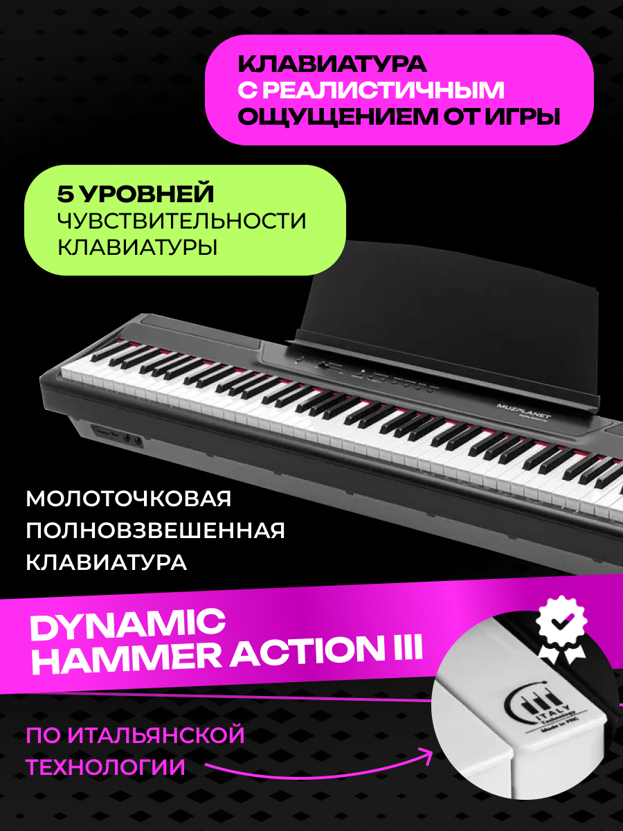 Благодаря вниманию к деталям и стремлению к идеалу инженеров компании MUZPLANET в данном инструменте можно в полной мере ощутить эффект исполнения, который в точности имитирует опыт игры на традиционном акустическом фортепиано.