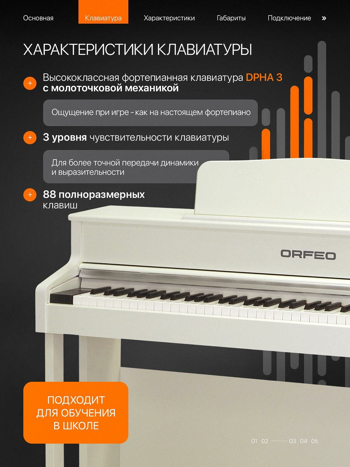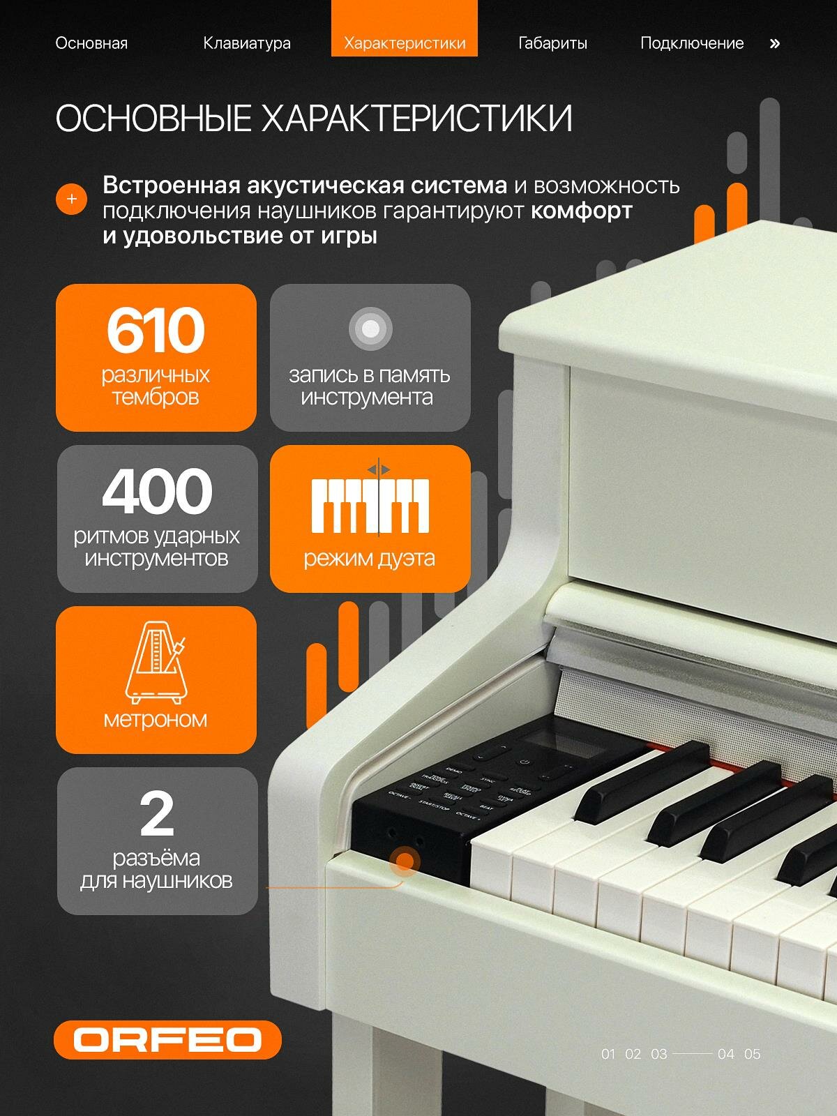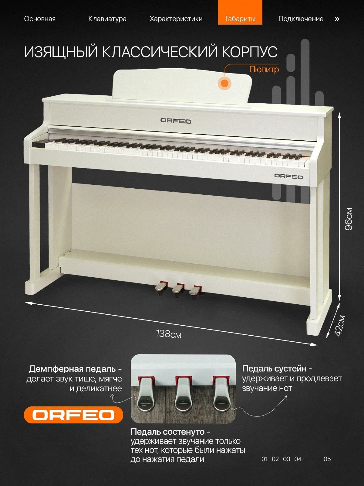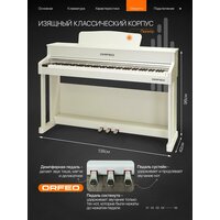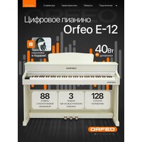 Восхитительное цифровое пианино Orfeo E-12 в благородном молочно-белом оттенке воплощает элегантность и современные возможности в одном инструменте. Модель E-12 является старшей, относительно модели E-9. Благодаря увеличенному корпусу, звучание инструмента отличается бОльшим объёмом и глубиной баса. Его классический корпус с крышкой для клавиатуры, три встроенные педали и практичный пюпитр для нот обеспечивают высокий комфорт и удобство в использовании.