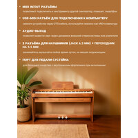 Разъемы: AUDIO OUT разъем, MIDI IN / OUT разъемы, USB разъем для подключения к компьютеру для использования музыкального ПО, 2 разъема для подключения наушников, разъем для подключения педали сустейна.