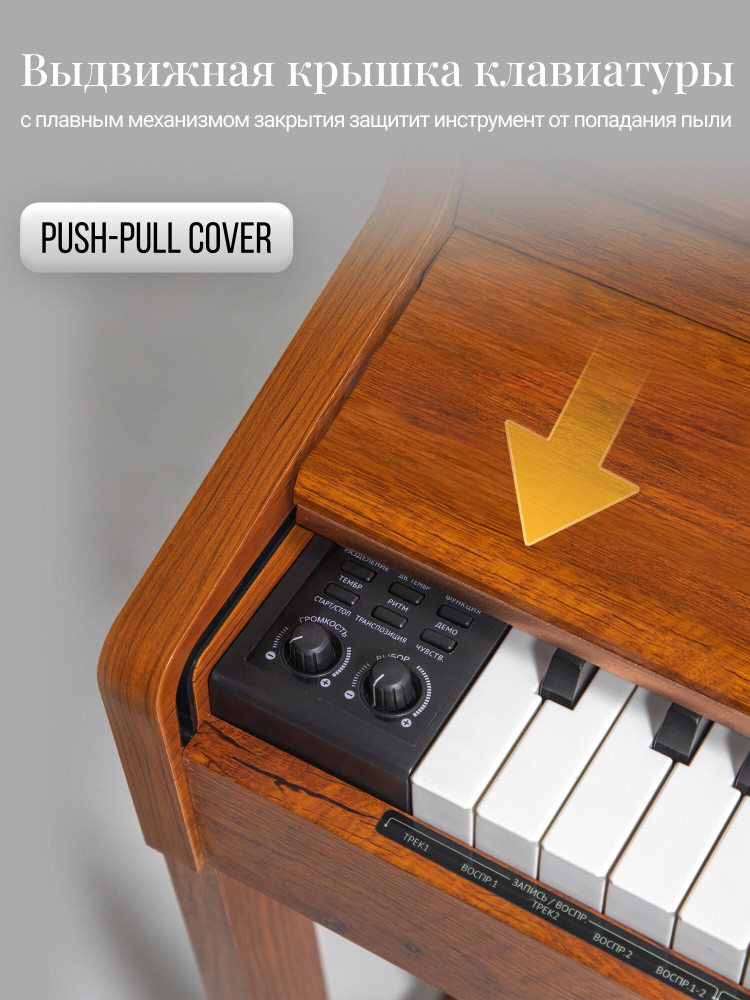 Пианино Tesler STZ-8810 оснащено выдвижной крышкой для клавиш с механизмом Push-pull. В отличии от стандартной откидной крышки, такая выдвижная конструкция исключает риск травмы из-за случайного захлопывания. После окончания игры вы можете закрыть сдвижную крышку клавиш, чтобы уменьшить количество пыли, попадающей внутрь. Это поможет сохранить инструмент в хорошем состоянии, и увеличить срок его службы.
