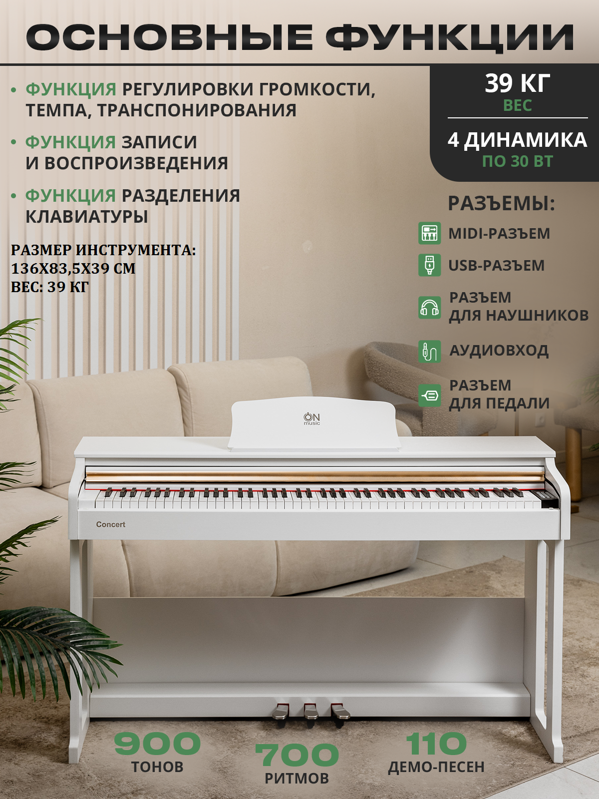 | Функции и опции | запись песен, молоточковая механика, транспонирование |