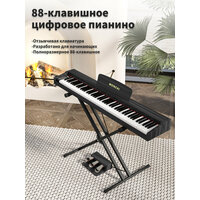 клавиатура 88, клавиатура фортепиано соответствует международным стандартам Крышка клавиатуры: без крышки; Звуковой сигнал: 128; Ритм: 100; Музыкальная демо-версия: 88 (1-88); Управление ритмом: двухтональный, клавиатура, метроном, сдвиг,; Управление аккордами: одним пальцем, несколькими пальцами; Музыка в формате MIDI (полифония): 128; Три педали: ударная педаль, мягкая педаль, ударная педаль; USB square с функцией MIDI: подключается к мобильным телефонам, компьютерам, планшетам и т. д. Два разъема для наушников (стерео 3,5 мм); Кнопка регулировки громкости регулируется произвольно в зависимости от громкости звука.