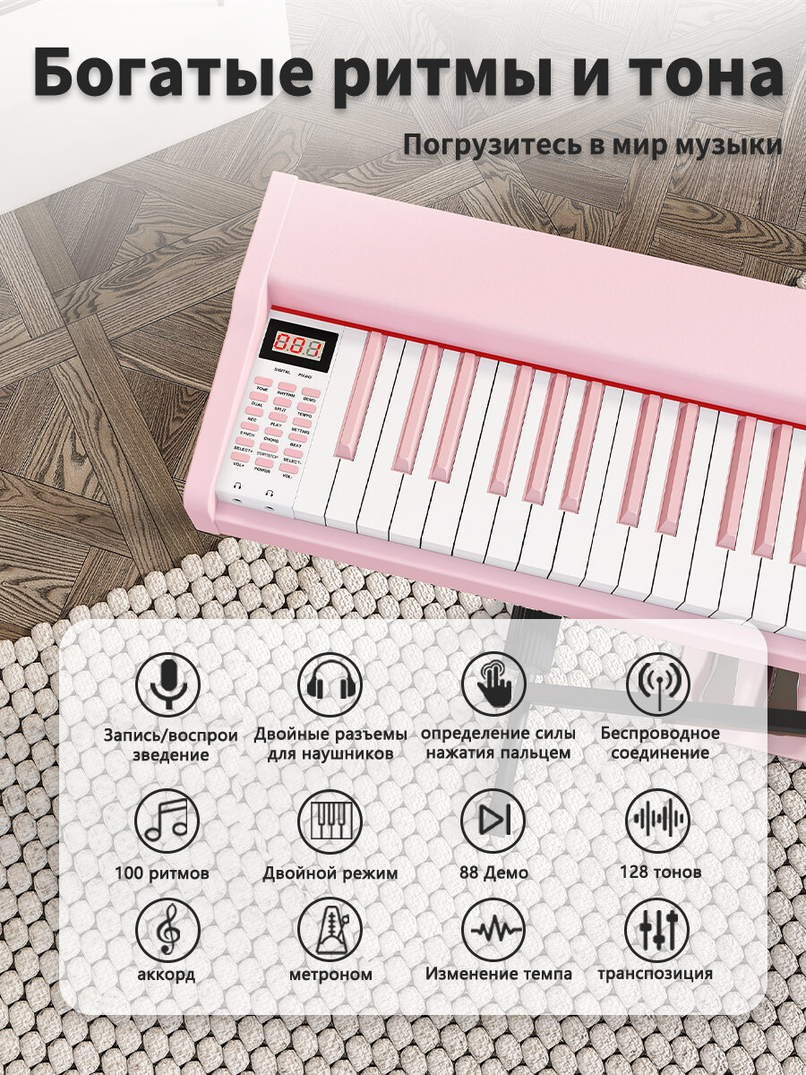 клавиатура 88, клавиатура фортепиано соответствует международным стандартам Крышка клавиатуры: без крышки; Звуковой сигнал: 128; Ритм: 100; Музыкальная демо-версия: 88 (1-88); Управление ритмом: двухтональный, клавиатура, метроном, сдвиг,; Управление аккордами: одним пальцем, несколькими пальцами; Музыка в формате MIDI (полифония): 128; Три педали: ударная педаль, мягкая педаль, ударная педаль; USB square с функцией MIDI: подключается к мобильным телефонам, компьютерам, планшетам и т. д. Два разъема для наушников (стерео 3,5 мм); Кнопка регулировки громкости регулируется произвольно в зависимости от громкости звука.