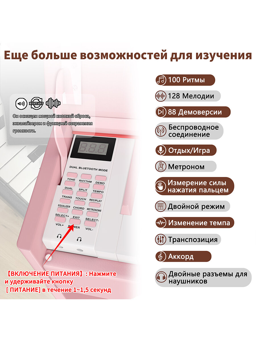 | Функции и опции | запись песен, крышка клавиатуры, метроном, молоточковая механика, чувствительность клавиатуры к послекасанию, эквалайзер |