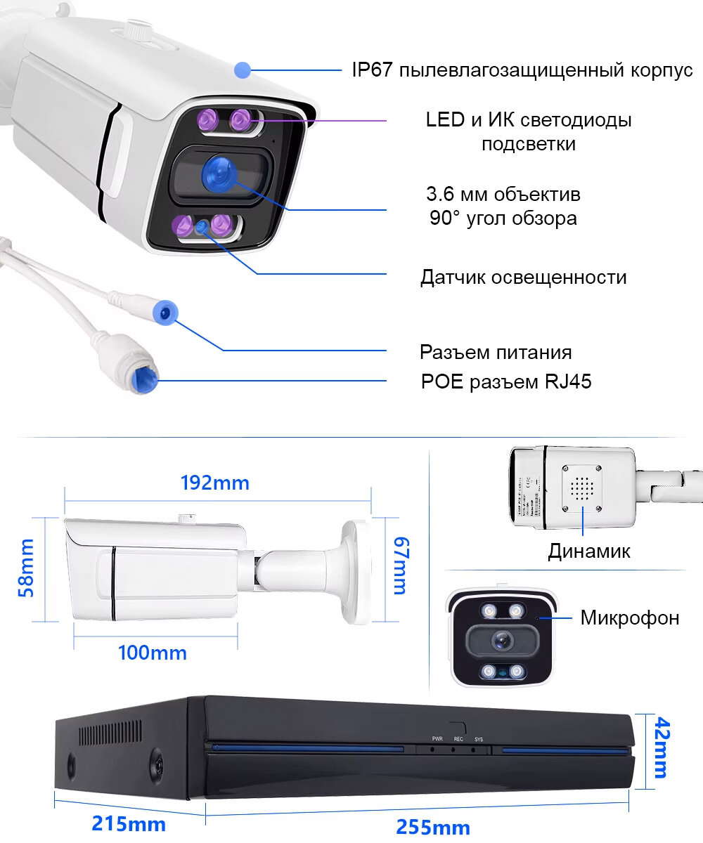 Фиксация данных ведется на жесткий диск объемом до 6Тб, приобретаемый отдельно. Можно записать большой объем информации, при этом не обязательно следить за переполнением носителя. При заполнении новые кадры автоматически перезаписываются поверх старых. Высочайшее разрешение в 1944Р (2K) обеспечит четкость картинки и отличную цветопередачу. Угол обзора в 90° избавит от необходимости докупать дополнительные объективы. Герметичный корпус защитит внутренние микросхемы от плохой погоды и любых осадков. Степень защиты IP67 позволяет использовать оборудование в местах с повышенной запыленностью.