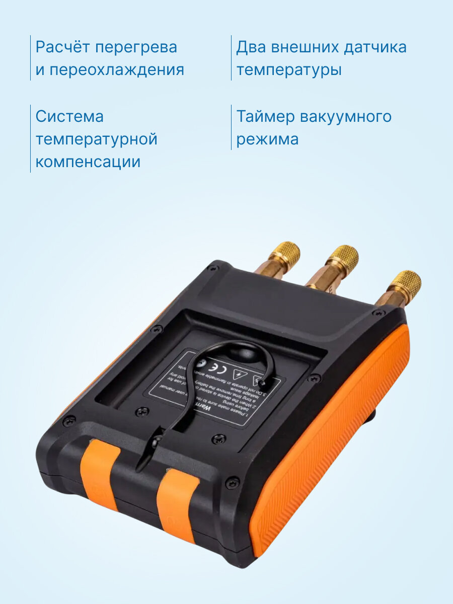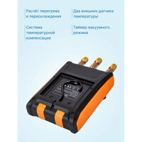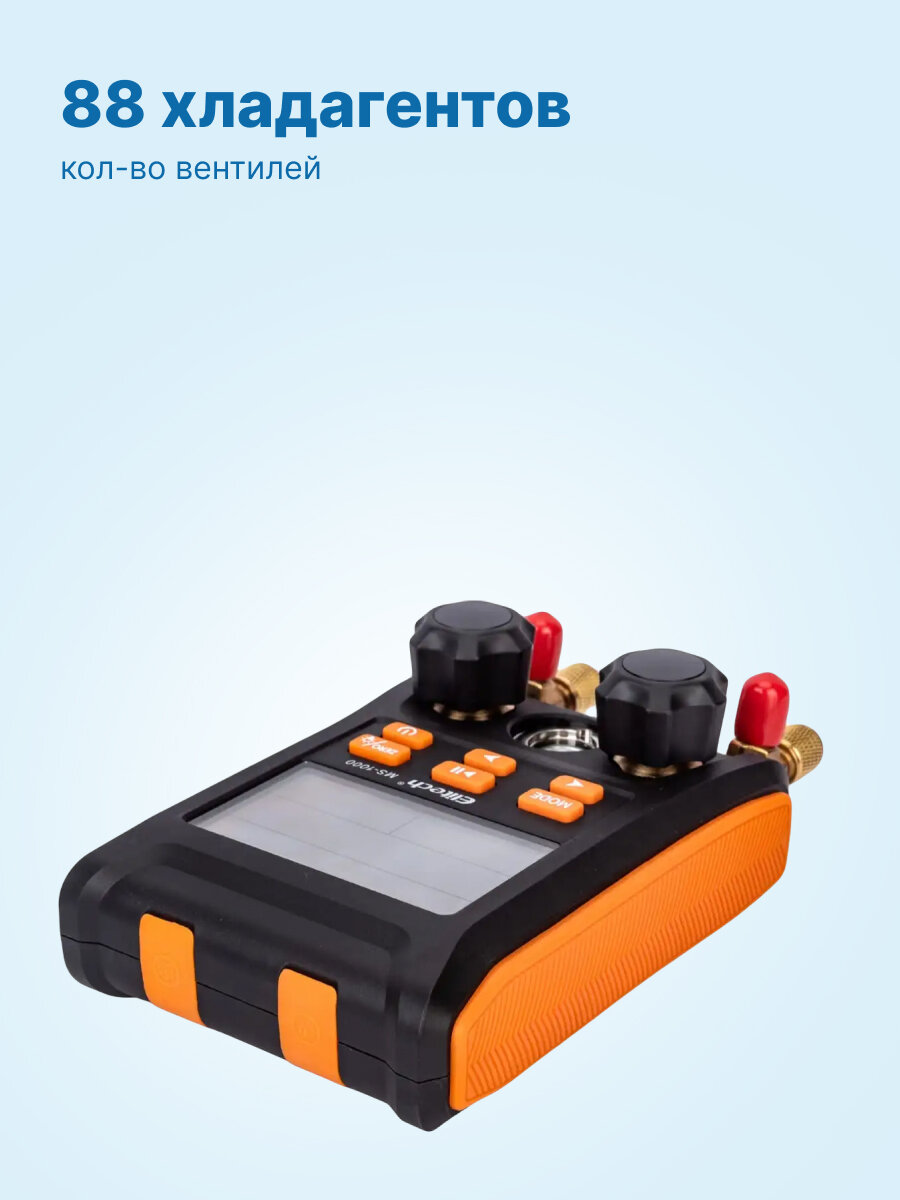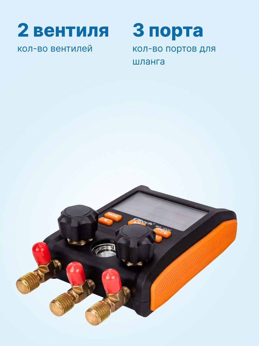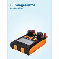 Цифровой манометрический коллектор с 2-х вентильными клапанами и 3-мя портами для шлангов, предназначен для заправки холодильных систем и кондиционеров, поддерживает 88 типов хладагентов, которые хранятся в памяти устройства. Преимущества прибора: Точный расчёт перегрева и переохлаждения в режиме реального времени Два внешних датчика температуры Двухклапанный (двухвентильный) коллектор с тремя соединениями для шлангов Система температурной компенсации Таймер вакуумного режима для отслеживания продолжительности испытаний Предустановленные в памяти прибора 88 типов хладагентов Большой ЖК-экран с подсветкой размером 3.75 дюйма Прочная конструкция корпуса