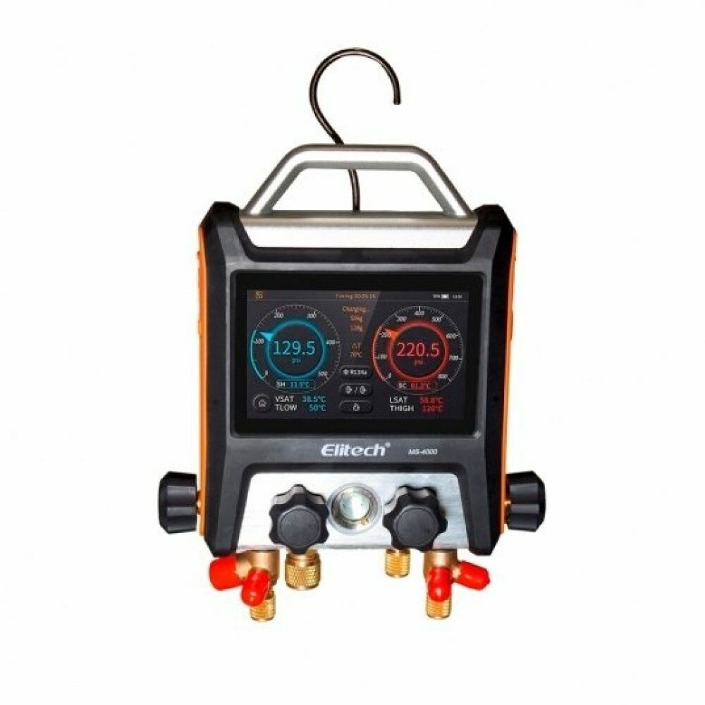 Цифровой манометрический коллектор с четырёхходовым блоком клапанов Elitech MS4000 – профессиональный электронный манометрический коллектор с 4-мя ходовыми клапанами, 4-мя портами, Bluetooth и внешним вакуумметром для заправки холодильных систем и кондиционеров.