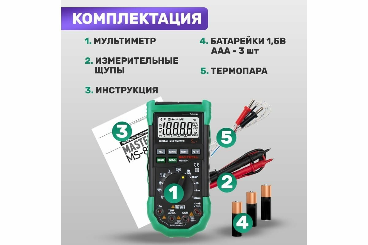 | Особенности | автоматический выбор диапазона измерений, подсветка дисплея, фиксация измерений |
