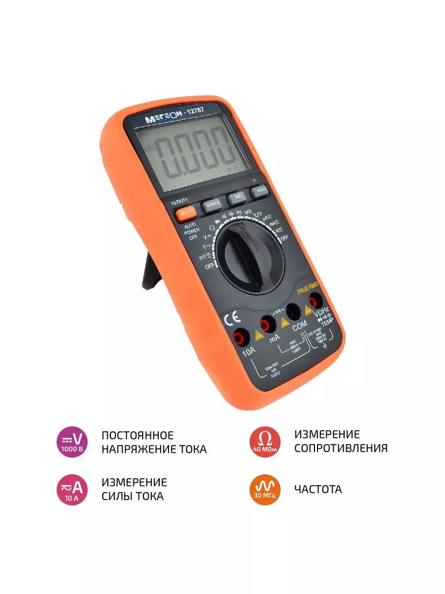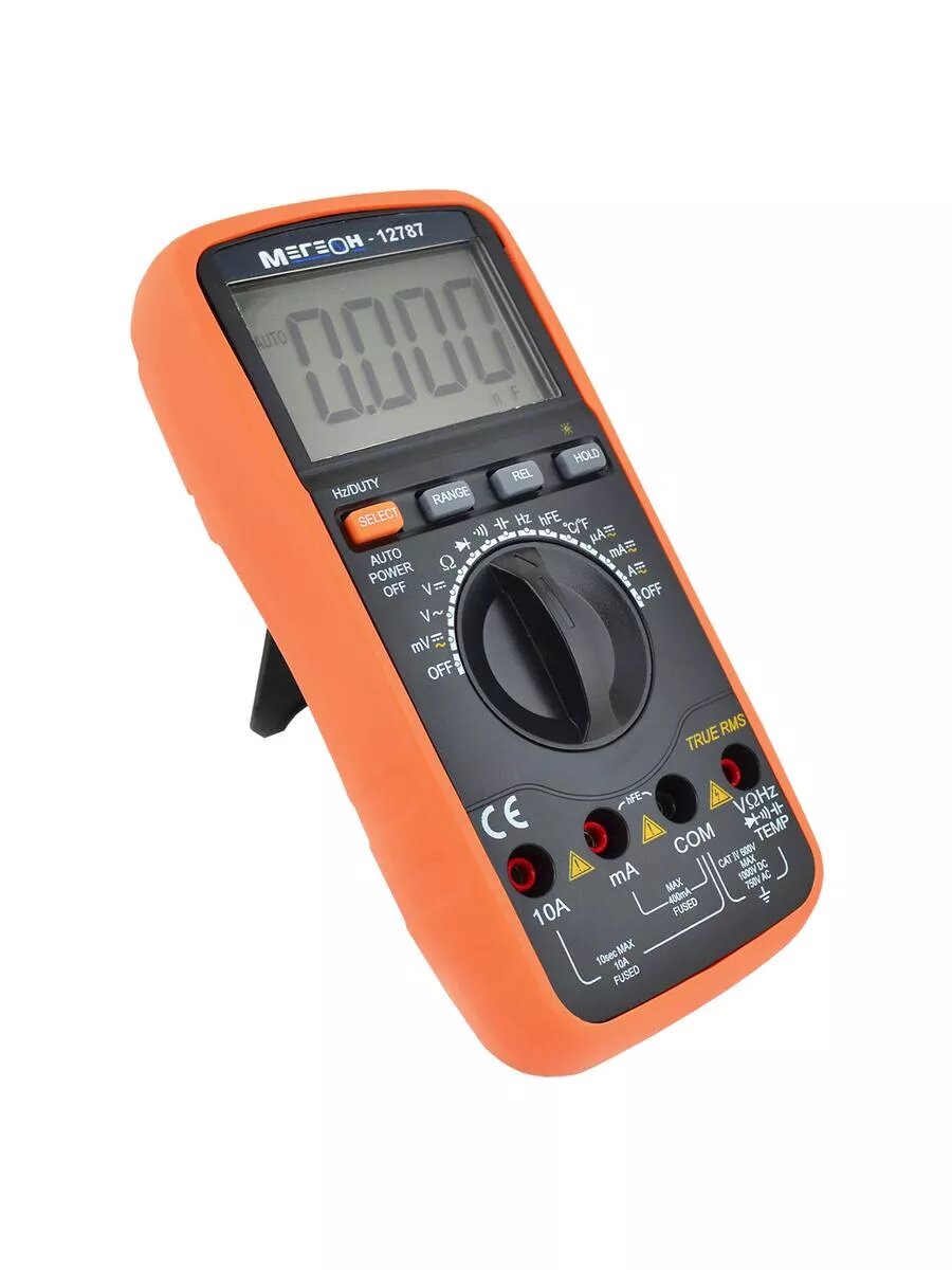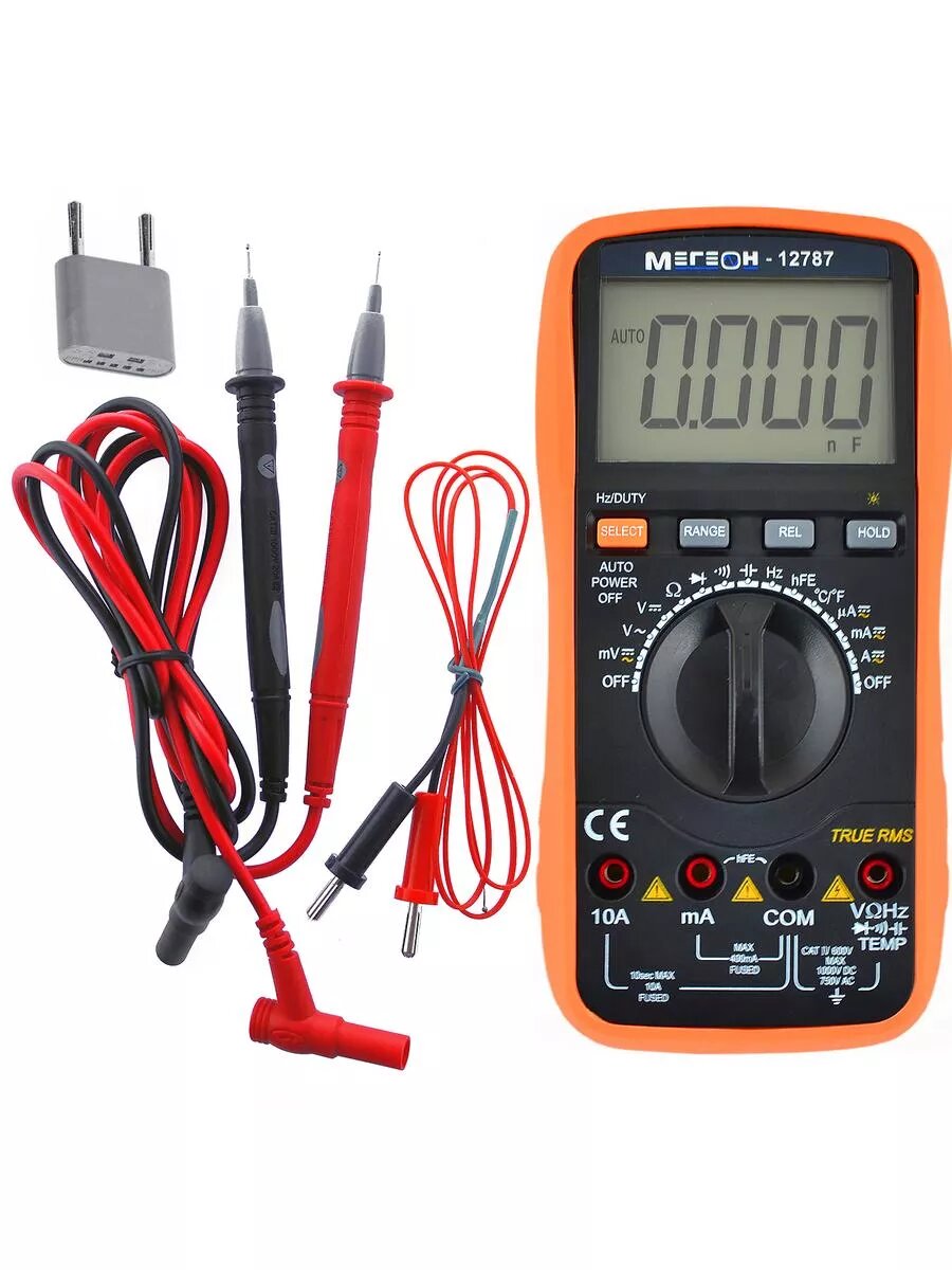 Мегеон 12787 (True RMS) – надежный и высокоэффективный цифровой мультиметр, который позволяет измерять переменное (True RMS) или постоянное напряжение, переменный (True RMS) или постоянный ток, частоту, емкость, сопротивление, температуру, а также может использоваться для выполнения проверки диодов, транзисторов и «прозвонки» цепи. Результаты измерений выводятся на ЖК-дисплей с легко читаемым цифровым индикатором 42 мм. Наличие подсветки ЖК-дисплея с функцией выключения через 20 с, режима энергосбережения и защита от перегрузки повышает удобство его эксплуатации. БИС АЦП с двойным интегрированием в основе прибора мегеон 12787 (True RMS) делает его надежным и востребованным измерительным прибором в лабораториях, на производстве и в домашнем хозяйстве. Станет незаменимым помощником специалистов и любителей.