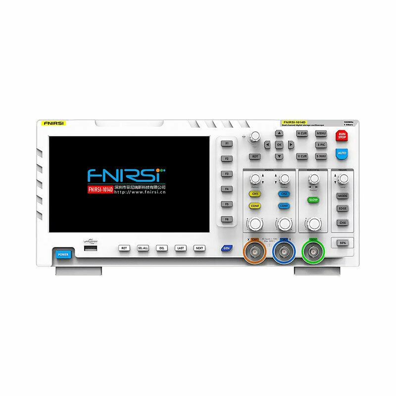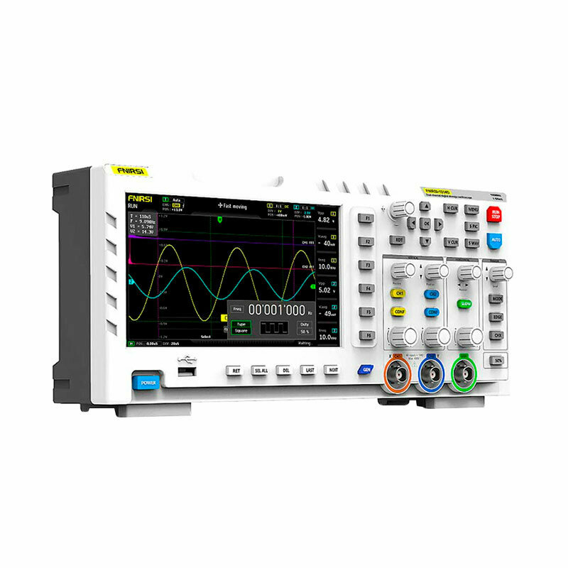 Цифровой осциллограф FNIRSI 1014D со встроенным генератором сигналов 10 МГц подойдет как для начинающих электронщиков, так и для заядлых радиолюбителей. Устройство совмещает в себе двухканальный запоминающий осциллограф с полосой пропускания 100 МГц и частотой дискретизации 1 ГВыб/с и DDS генератор сигналов с 14-битным разрешением. Встроенная память 1 Гб позволяет хранить до 1000 скриншотов экрана и форм сигналов. С помощью кнопки GEN включается встроенный генератор с максимальной полосой пропускания 10 МГц (синусоидальный сигнал), для остальных – 2 МГц. Он обеспечивает генерацию до 14 функций. С использованием кнопки AUTO прибор автоматически настроит сигнал измерений. Все проводимые операции отображаются на 7-дюймовом TFT-дисплее. Глубина записи 240 Кб.