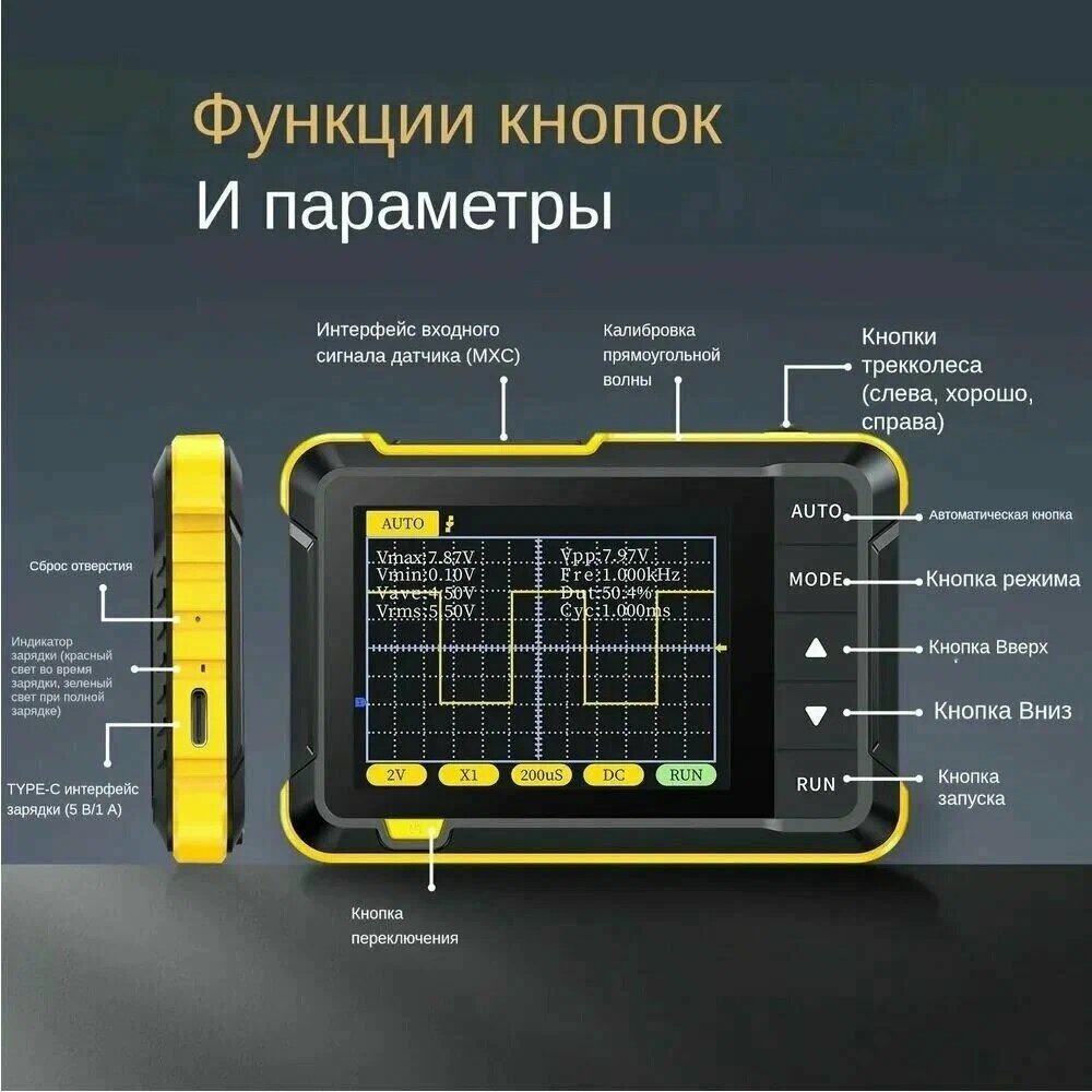 Внимание Лот включает FNIRSI DSO152 + Щуп осциллографа универсальный FNIRSI P6100 DC-6MHz DC-100MHz 1:10 комплект Карманный осциллограф FNIRSI DSO152 - это незаменимый инструмент для разработчиков и диагностов электронных устройств. Он позволяет видеть не только текущее значение напряжения, но и развертку сигнала во времени, что дает возможность детально анализировать процессы, происходящие на схеме. Одноканальный осциллограф FNIRSI DSO152 легко помещается в карман и обладает портативным исполнением. Он оснащен цветным 2,8-дюймовым LCD экраном с разрешением 320x240 точек, что обеспечивает четкое и яркое изображение. Осциллограф имеет полосу пропускания 200 кГц и позволяет анализировать все формы волновых сигналов, включая синусоиду и ШИМ. Частота дискретизации составляет 2,5 МВыб/с, обеспечивая высокую точность измерений. FNIRSI DSO152 оснащен встроенным генератором сигналов с частотой 1 кГц и рабочим циклом 50%. Это позволяет проводить дополнительные тесты и измерения. Осциллограф имеет 8 автоматических измерений, включая частоту, пик-пик, заполнение импульса, амплитуду, максимум, минимум, период и RMS. Питание устройства осуществляется от встроенной литиевой батареи емкостью 1000 мАч, которая гарантирует до 4 часов непрерывной работы. Зарядка осуществляется через USB Type-C порт при помощи адаптера питания 5В / 1A. Подсветка дисплея и цветной экран делают работу с осциллографом комфортной даже при слабом освещении. Вес устройства составляет всего 100 грамм, что делает его удобным для переноски и использования в полевых условиях.