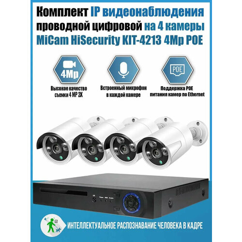 Цифровой проводной IP POE комплект видеонаблюдения на 4 камеры 4Mp со звуком для улицы и помещений MiCam KIT-4213P: сравнение цен, характеристики, фото, актуальное наличие и цены.