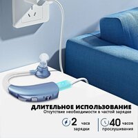 Внутриканальный слуховой аппарат идет в комплекте с зарядным устройством: зарядный кабель полностью заряжает аппарат за 2 часа, после чего устройство сможет работать до 45 часов без подзарядки.