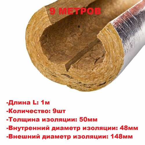 РАЗМЕРЫ: -Длина L: 1м -Количество: 9 шт -Толщина изоляции: 50 мм -Внутренний диаметр изоляции: 48 мм -Внешний диаметр изоляции: 148 мм