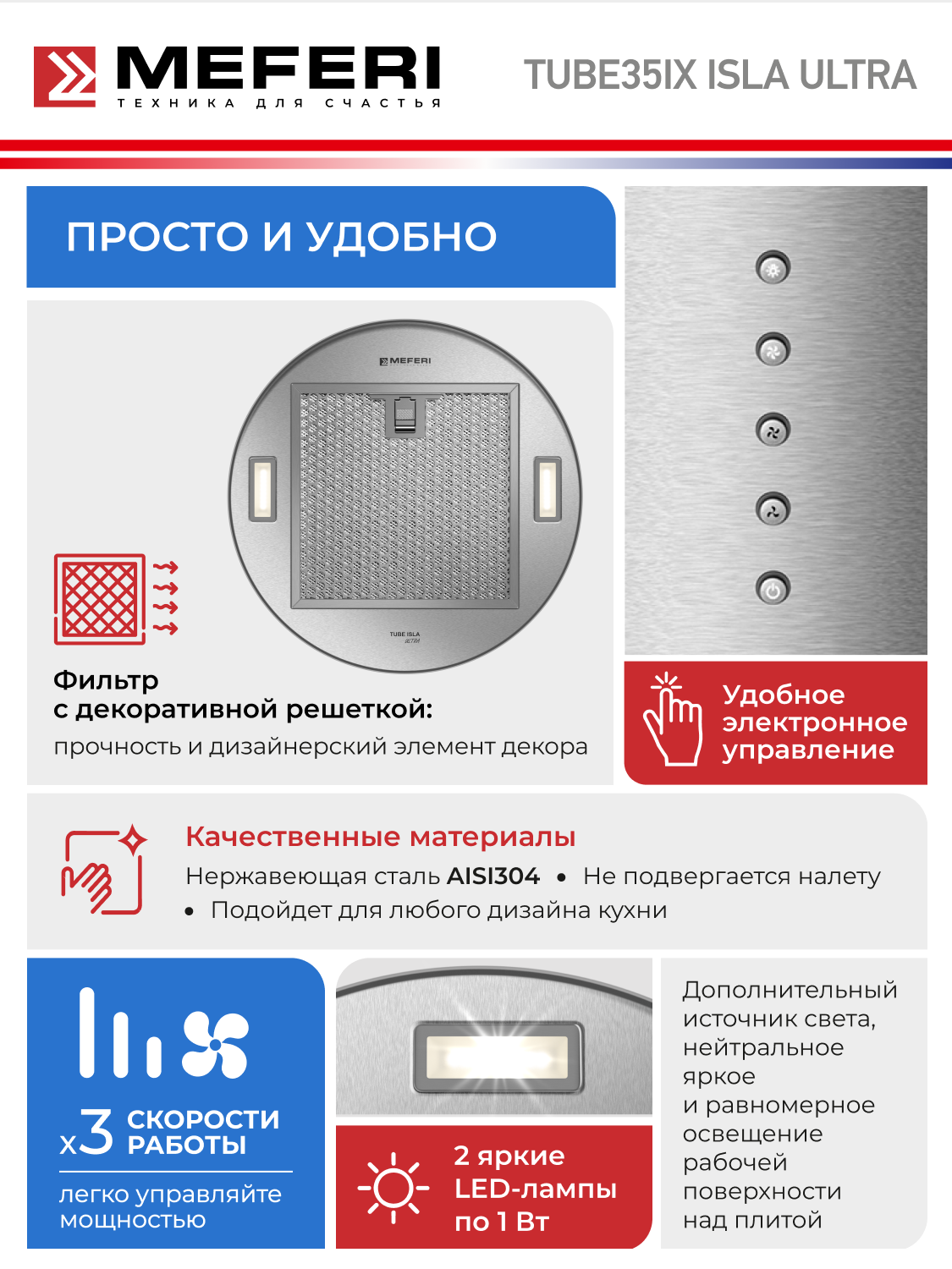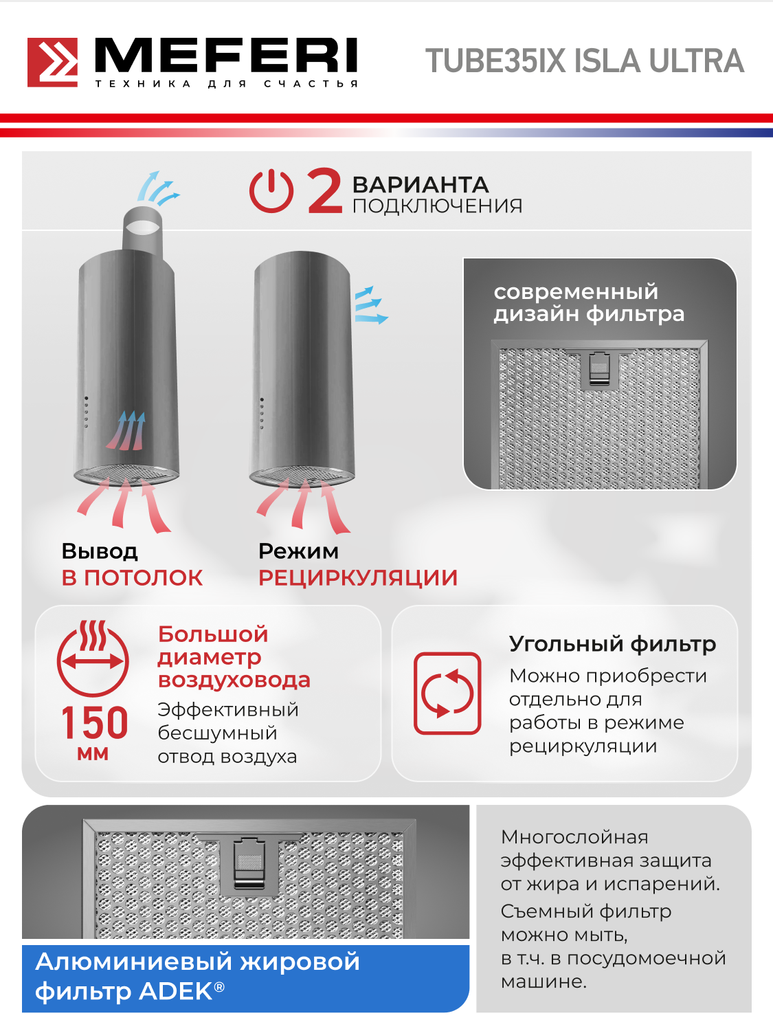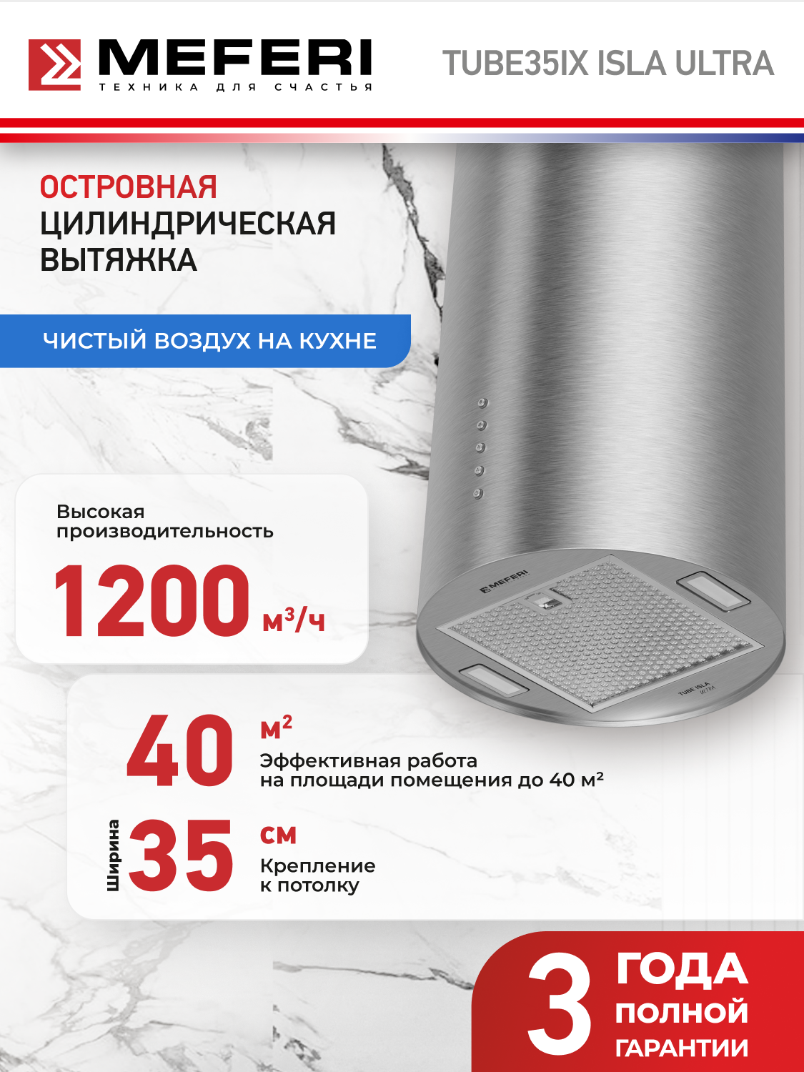 MEFERI TUBE35IX ISLA ULTRA - это не просто вытяжка, это стильное и функциональное решение для вашей кухни, которое сделает приготовление пищи более комфортным и приятным. Не упустите возможность приобрести эту уникальную вытяжку и создать идеальную атмосферу на вашей кухне!