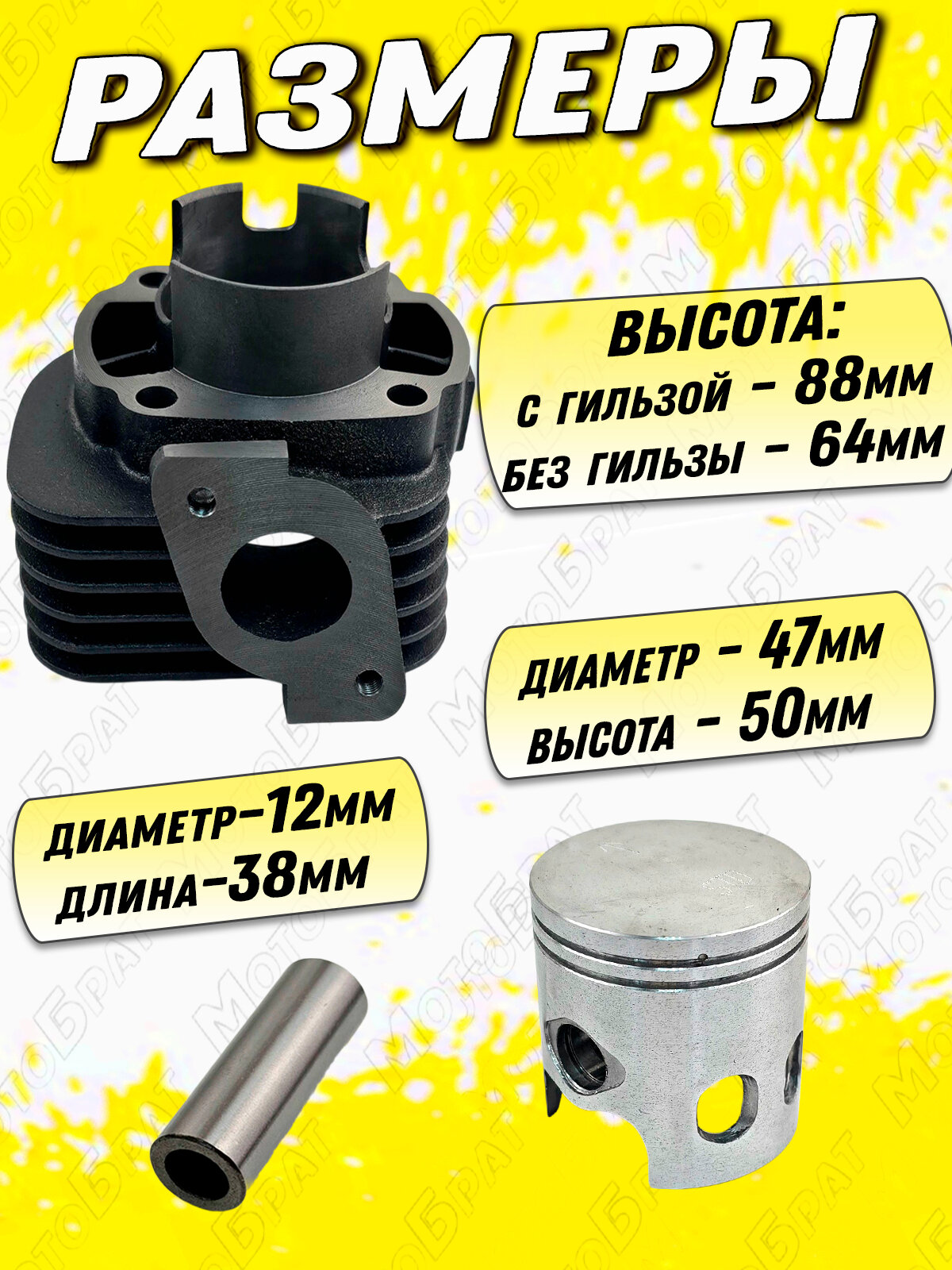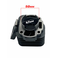 Цилиндро-поршневая группа подойдет для установки на скутера с маркировкой двигателя 2Т 1E40QMB и объемом 70см3. Основные характеристики: - Размеры ЦПГ: 113,5х97х88 мм. (высота цилиндра без гильзы – 64 мм). - Диаметр гильзы: внешний 51 мм, внутренний 47 мм. - Диаметр поршня: 47 мм. Высота поршня: 50 мм. - Диаметр пальца: 12 мм. Длина пальца: 38 мм. - Расстояние по центрам между отверстиями шпилек по диагонали: 70,5 мм. Комплектация: - Цилиндр в сборе с гильзой – 1 шт. - Поршень – 1 шт. - Палец поршневый – 1 шт. - Комплект поршневых колец. - Стопорные кольца. - Прокладки цилиндра (верхняя и нижняя).