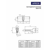 | Дополнительная информация | Цилиндровые механизмы моделей Apecs Premier XR предназначены для комплектации дверных замков, с отверстия ми под евроцилиндр. Индекс «С» означает наличие у цилиндрового механизма поворотной ручки для отпирания и запирания механизма замка с внутренней стороны двери без использования ключа. Цилиндровые механизмы Apecs XR - самые качественные в сегменте латунных цилиндров Apecs, предназначенных для входных дверей. Прошли испытания и сертификацию в России по 4 классу согласно ГОСТ 5089-2011. |