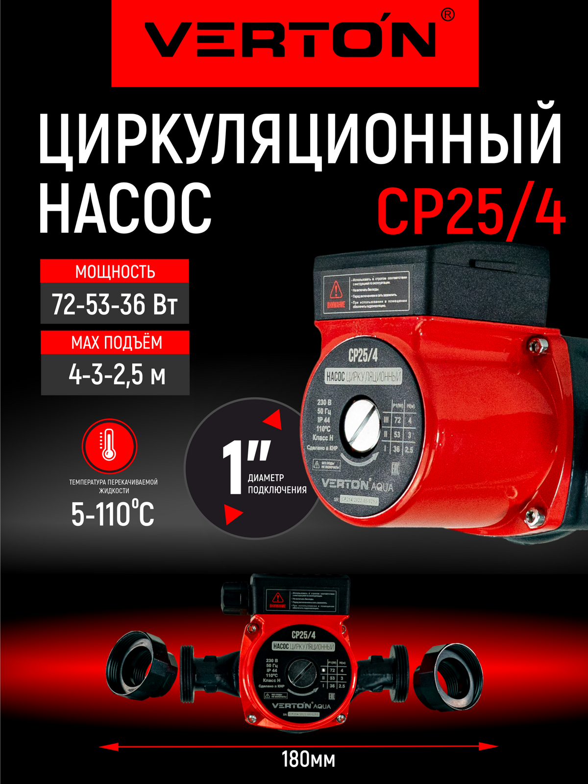 Циркуляционный насос Verton AQUA CP25/4(72-53-36Вт, Qmax40-30-20л/мин, Hmax 4-3-2.5, L180мм, подкл.38мм): сравнение цен, характеристики, фото, актуальное наличие и цены.