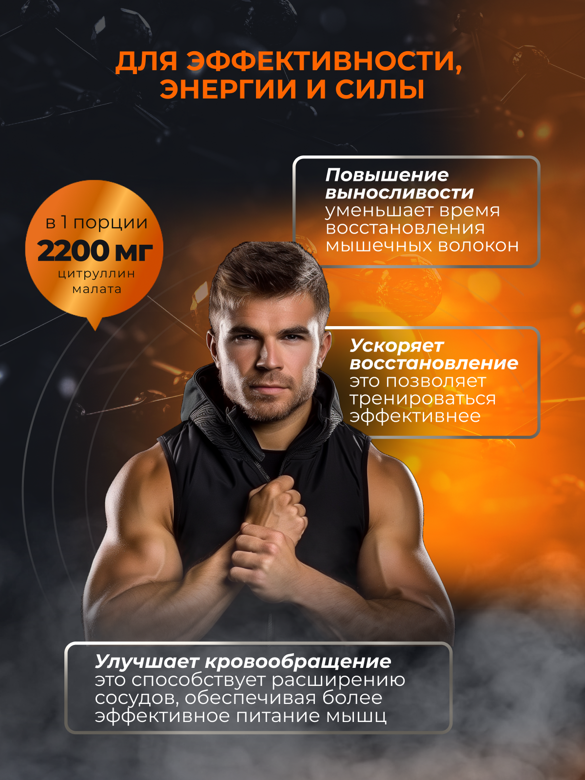 размер порции в капсулах/таблетках: 3; назначение: увеличение производительности; рекомендации по применению: принимайте по 3 капсулы за 30 минут до тренировки, запивая водой или безалкогольным напитком; состав: L-цитруллин малат, магния стеарат, желатин (капсула)