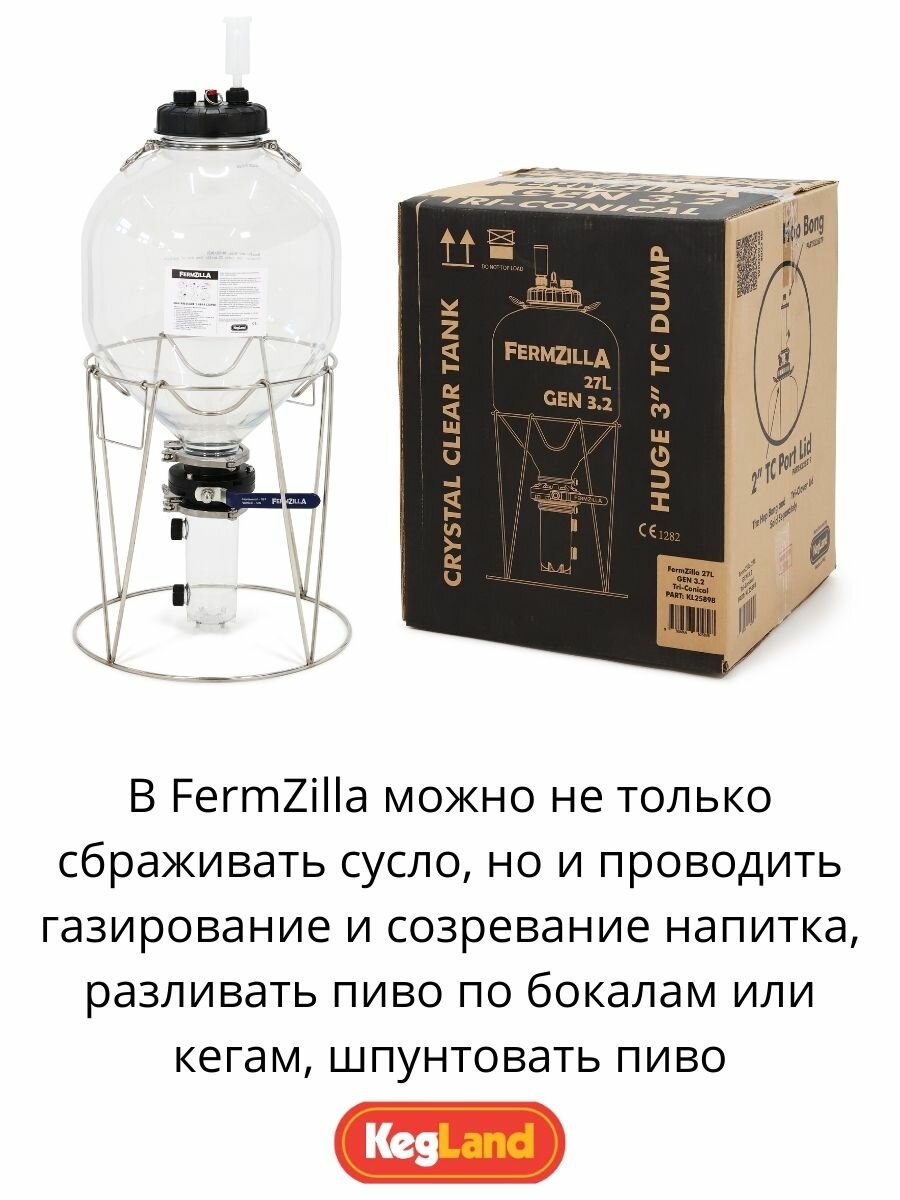 Комплектация: Пластиковая ёмкость FermZilla 1 шт. Подставка из нержавеющей стали с ручками 1 шт. Ручки для переноски из нержавеющей стали 1 шт. Крышка ёмкости 1 шт. Чёрные колпачки-заглушки 4 шт. Разборный трёхсекционный бесшумный гидрозатвор 1 шт. ЖК термометр-наклейка 1 шт. Наклейка с разметкой литража 1 шт. Дисковый кран с кламповыми соединениями, переход с 3” на 2” 1 шт. Трёхсоставной кламповый зажим 3” 1 шт. Уплотнитель для клампового зажима 3” 1 шт. Кламповый зажим 2” 1 шт. Уплотнитель для клампового зажима 2” 1 шт. Ёмкость для сбора осадка 1000 мл 1 шт. Крышка ёмкости для сбора осадка с кламповым соединением 2” 1 шт. Запасное уплотнительное кольцо для крышки основной ёмкости 1 шт. Запасное уплотнительное кольцо для крышки ёмкости для сбора осадка 1 шт.