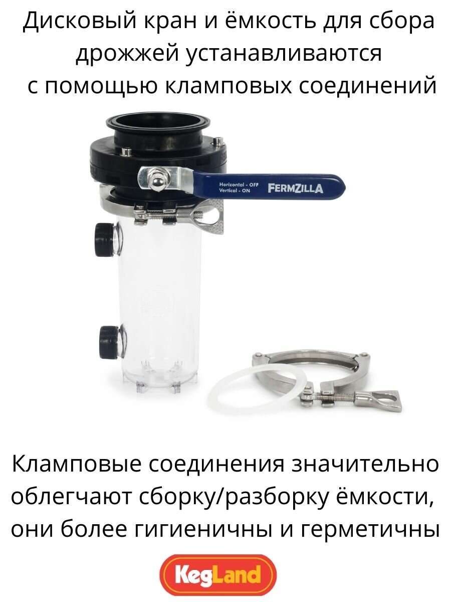 Цилиндро-конический танк FermZilla — доступный пластиковый ферментер с коническим основанием. Способность держать давление превращает его в настоящий Юнитанк. Это уже третье, улучшенное поколение Юнитанка — теперь дисковый кран и ёмкость для сбора дрожжей присоединяются к ферментеру с помощью кламповых, а не резьбовых соединений. Кламповые соединения значительно облегчают сборку/разборку ёмкости, кроме того они более гигиеничны и герметичны.