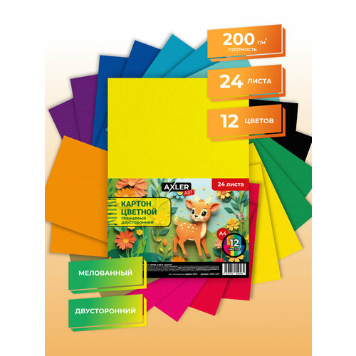 Купить Цветной картон А4 AXLER ART, двусторонний для школы, набор 24 листа, глянцевый с доставкой по всей России.
