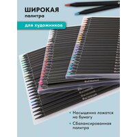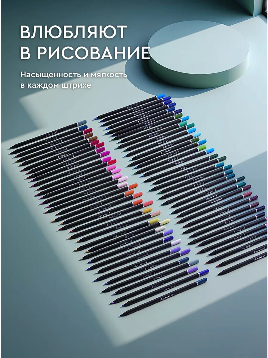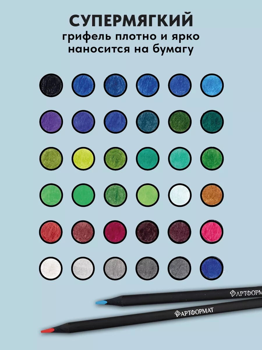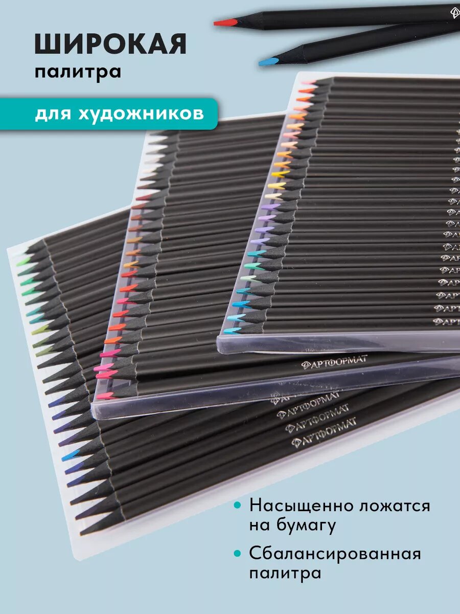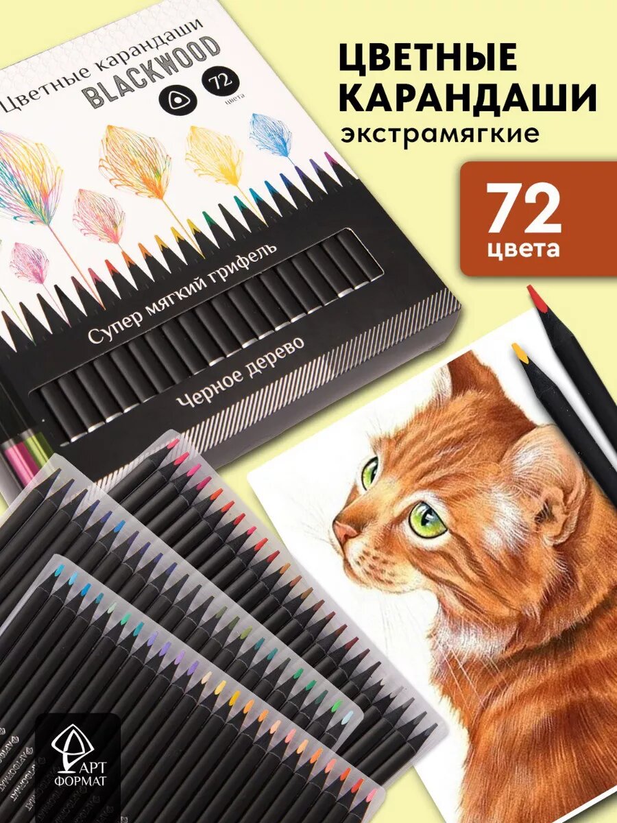 Карандаши цветные АРТформат Blackwood 72 цвета с супермягким грифелем. Высококачественные карандаши из черного дерева с супер мягким и супер ярким грифелем. Стильный черный матовый корпус в художественном дизайне с кончиками в тон цвета карандашей подчеркнет уникальность их обладателя. Яркие сочные цвета одинаково хорошо подойдут для релакс-раскрашивания, детских рисунков, эффектных скетчей, профессиональных зарисовок и даже для рисования на черной бумаге. Супер мягкий, но ударопрочный грифель позволит добиться необходимой насыщенности цвета почти без усилий. Тонкий помол пигментов даст возможность получения плавных цветовых переходов. Эргономичный трехгранный корпус карандашей Блэквуд обеспечит долгое комфортное использование. Мягкие цветные карандаши имеют трехгранную форму корпуса. Большой подарочный набор цветных карандашей понравится художникам, студентам художественных школ и вузов. Диаметр грифеля - 3 мм. Они подойдут для школы в качестве детских карандашей для рисования - так как насыщенность высокая, ребенку не придется сильно давить на карандаши. Цветные карандаши из черного дерева - это отличный подарок художнику на новый год, 23 февраля, 8 марта.