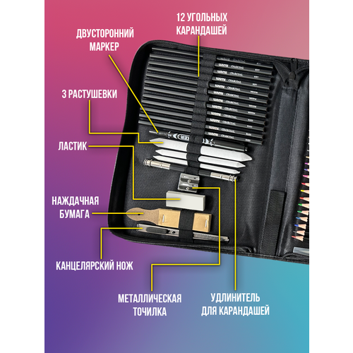 12 угольных и 12 обычных чернографитных карандашей разной твердости и мягкости (5h, 4h, 3h, 2h, hb, b, 2b, 3b, 4b, 5b, 6b, 8b). 12 ярких цветных и 12 с металлическими оттенками – для отработки различных художественных техник.