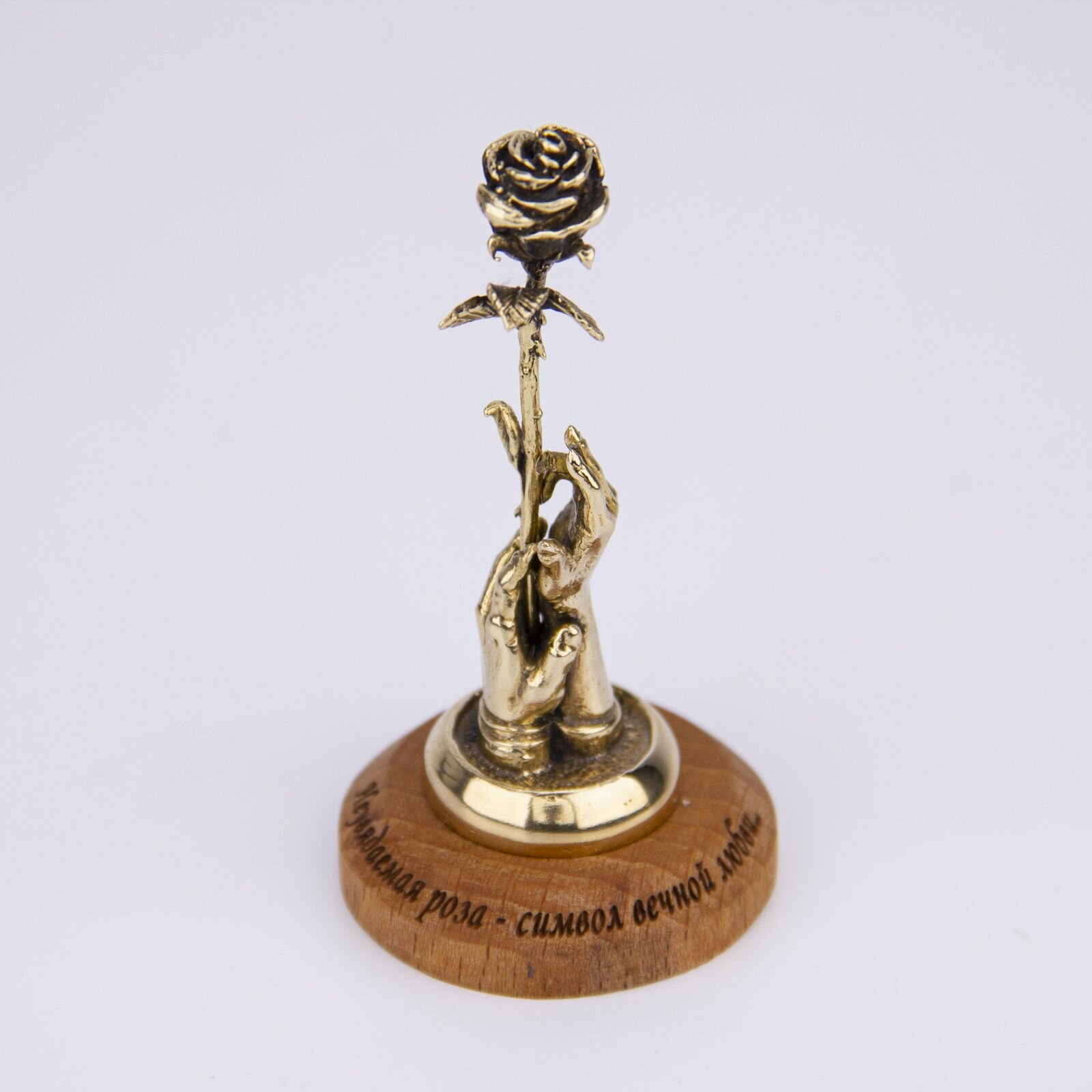 Существует красивая легенда о любви Мастера к девушке. Он подарил своей возлюбленной большой букет роз и дал обещание любить её так долго, пока не завянет последняя роза. Девушка в начале расстроилась, ведь цветы не вечны. Но среди роз она заметила одну необычную. Это была роскошная роза из бронзы очень тонкой работы, как две капли воды похожая на живой цветок. С тех пор неувядаемая роза является символом бесконечной любви. Неувядаемая роза — это долгосрочный вклад в отношения с любимой женщиной. Согласны, что дарить такую утонченную тихую роскошь — это запрещённый приём. Теперь мысли женщины будут заняты только вами. После преподнесения такого подарка, мужчина, без всякого сомнения, возглавит список фаворитов своей избранницы и будет обречён на бесконечное счастье с ней! Неувядаемая роза — незаурядный подарок на день рождения, юбилей, день свадьбы. Объяснение в любви, предложение руки и сердца — прекрасный повод для такого подарка. Да можно просто без повода! Ведь одна роза, подаренная от всего сердца без повода, выражает больше, чем огромный букет, подаренный на юбилей. Ваза выполнена из бесцветного акрила. Реплика знаменитой коллекции изящных вазочек из горного хрусталя Карла Фаберже. Исторично, изысканно, мило, душевно. Роза — бронза, точное художественное литье. Ваза-держатель "Руки" — бронза, точное художественное литье. Подставка — бук. Диаметр — 4,2 см. Длина цветка — 6 см. Размер общей композиции — 8,5 х 4,2 см. Коробка — картон, УФ-печать. Размер коробки — 12,5 х 7,5 х 5,5 см.