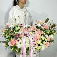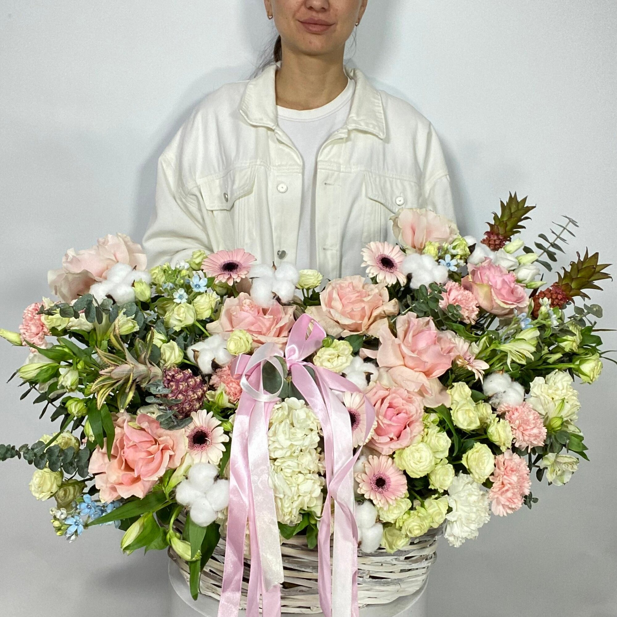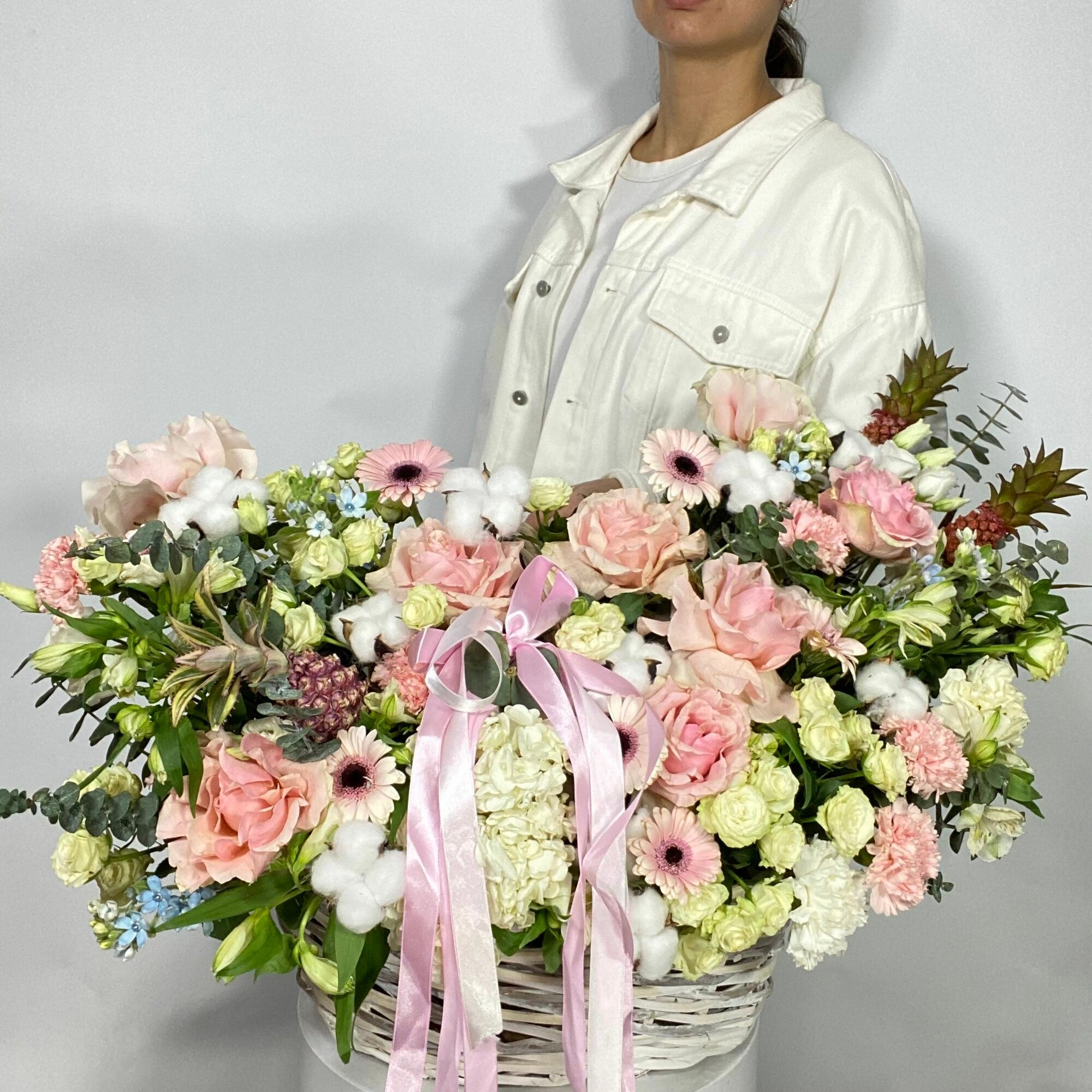 альстромерия, гвоздика, гербера, гортензия, роза, хлопок, эвкалипт, эустома