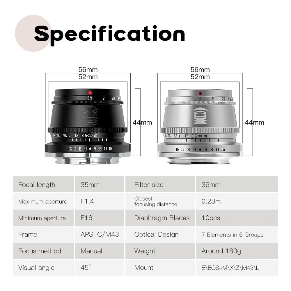 Объектив TTArtisan 35 мм F1.4 APS-C Prime для Sony E Mount Fujifilm XF Canon M Leica L Nikon Z Panasonic Olympus M43 Объектив для камеры, Black, Canon RF: сравнение цен, характеристики, фото, актуальное наличие и цены.