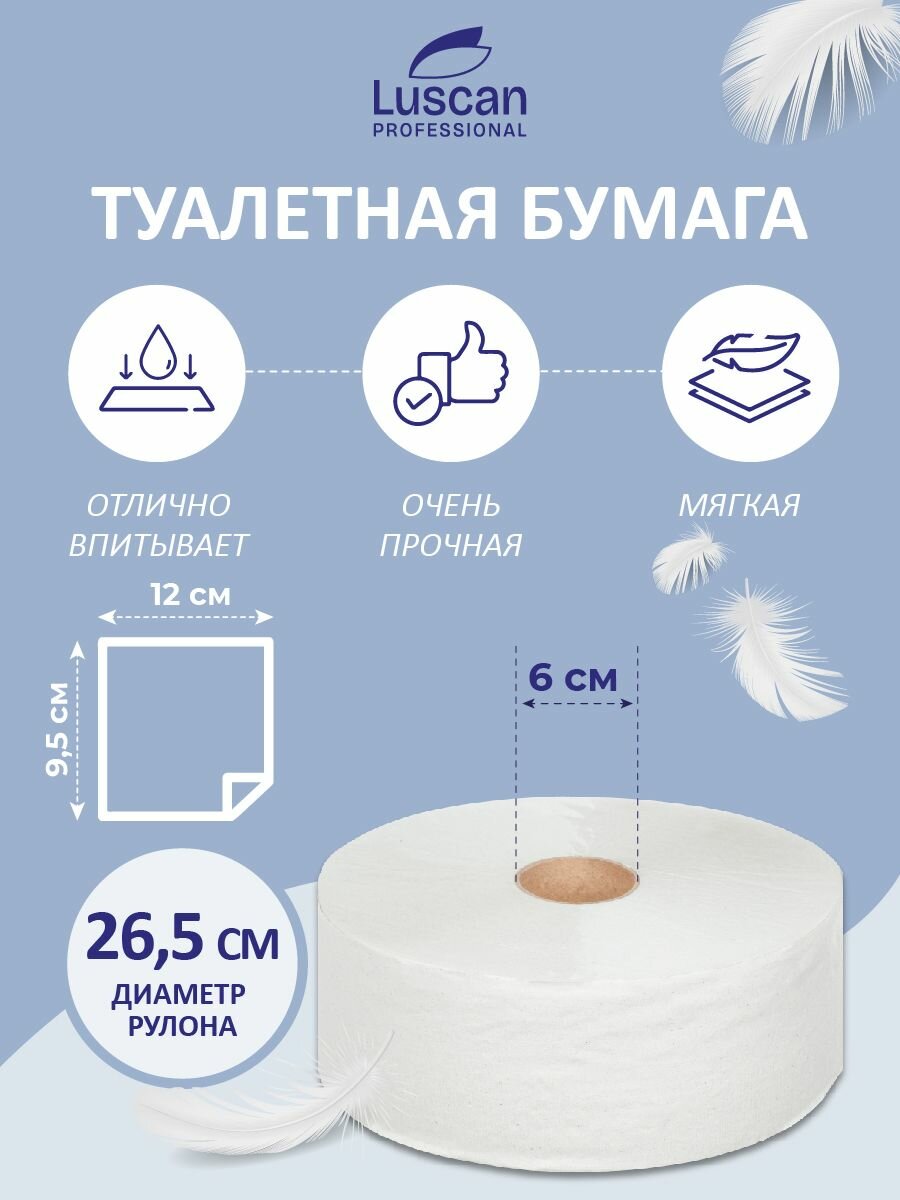 Бумага туалетная в рулонах Luscan Profеssional 1-слойные 6 рулонов по 525 метров (арт.601110). Бумага туалетная для диспенсера Luscan Profеssional. Однослойная вторичная целлюлоза. Подходит для туалетных комнат очень высокой проходимостью, таких как ресторан, офис, торговый центр, аэропорт, железнодорожный вокзал и т. д. Высокая емкость: минимум обслуживания. Изготовлено из вторичного сырья. Размеры: длина рулона 525 м, ширина рулона 9.5 см, диаметр рулона 26.5 см, диаметр втулки 6 см.