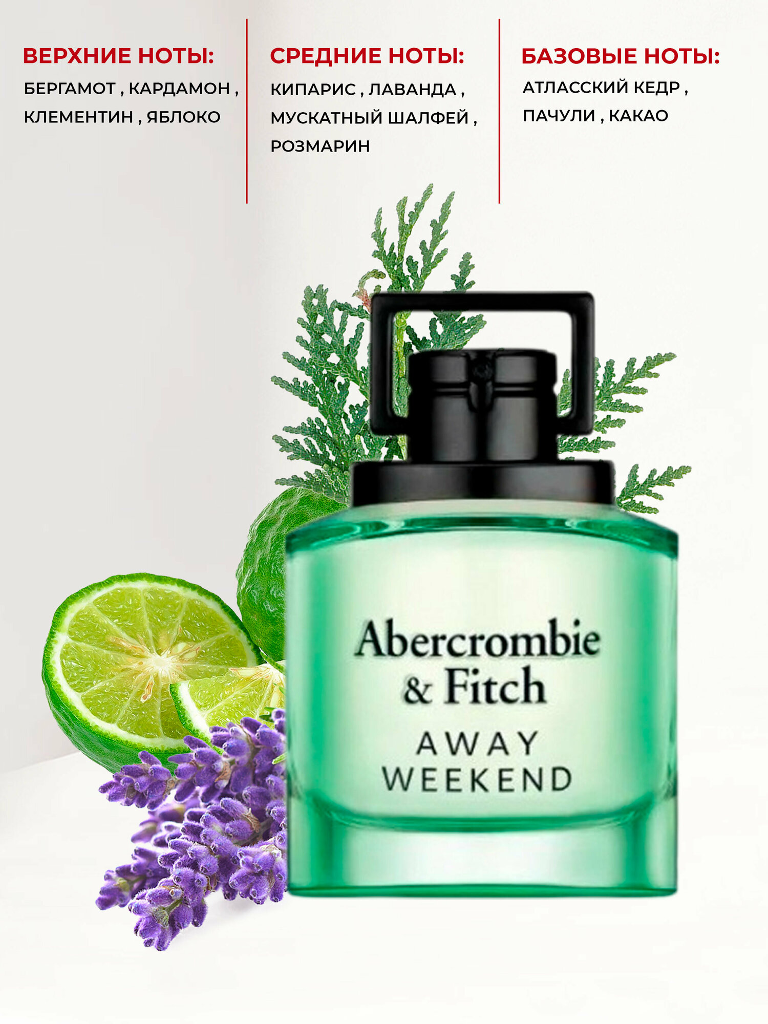 Abercrombie & Fitch Away Weekend Man — непринужденный мужской фужерно-цитрусовый аромат, выпущенный в 2023 году американским брендом Abercrombie & Fitch в рамках ароматического дуэта Away Weekend. Разработанный парфюмером Клодом Диром аромат поможет проникнуться духом свободы и смелых решений, вырваться из повседневной рутины и устроить себе приключение, о котором будет приятно вспомнить зимними вечерами. Верхний аккорд парфюма покоряет свежестью цитрусовых нот клементина и бергамота, запахом сочного яблока и горьковато-пряными оттенками кардамона. Им на смену в сердце композиции Abercrombie & Fitch Away Weekend Man приходит душистая лаванда, смолистый кипарис, травянисто-пряные оттенки розмарина и мускатного шалфея. Освежающий взрыв бергамота и шалфея контрастирует с притягательной базой из смолистого атласского кедра, пряного пачули и душистого бархатистого какао. Кроме того, мужские духи могут стать идеальным подарком для вашего мужа, брата, друга, любимого мужчины или папы. Ведь каждый мужчины мечтает о такой роскошной туалетной воде, которая станет для него настоящим сокровищем. Выразите свою любовь и заботу, выбрав этот аромат для своего особенного мужчины, и он будет вас помнить всегда. Благодаря этому парфюму, вы сможете наслаждаться ярким и свежим ароматом в течение всего дня, вне зависимости от времени года. Он идеально подходит и для работы, и для отдыха, и даже может стать прекрасным подарком на праздники, такие как 23 февраля, новый год или день рождения.