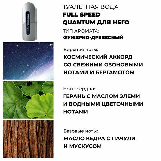 Туалетная вода Full Speed Quantum 75мл. Испытай неизведанное с новым ароматом, вдохновленным бесконечным и загадочным космосом. Инновационный космический аккорд из бодрящих озоновых нот и теплого янтаря в сердце аромата зарядит адреналином и подарит взрывное ощущение свежести. Аромат разработан с помощью Carto AI — инструмента на базе искусственного интеллекта, использующего науку и технологии для экстраординарных и новаторских обонятельных открытий. ТИП аромата: фужерно-древесный. Ноты: • верхние ноты: космический аккорд, свежие озоновые ноты, бергамот. • ноты сердца: герань, масло элеми, водные цветочные ноты. • шлейф: масло кедра, пачули, мускус. Парфюмерный ДОМ: Givaudan. Парфюмер: Carto AI - искусственный интеллект. Страна производства: Россия/Польша. . ull speed туалетная вода мужская, мужской аромат, мужской дезодорант, туалетная вода эйвон, одеколон, духи эйвон, парфюмерная вода, туалетная вода мужская, для всех возрастов мужской парфюм, в офис, поход в ресторан, подарок мужу отцу парню любимому брат сыну папе