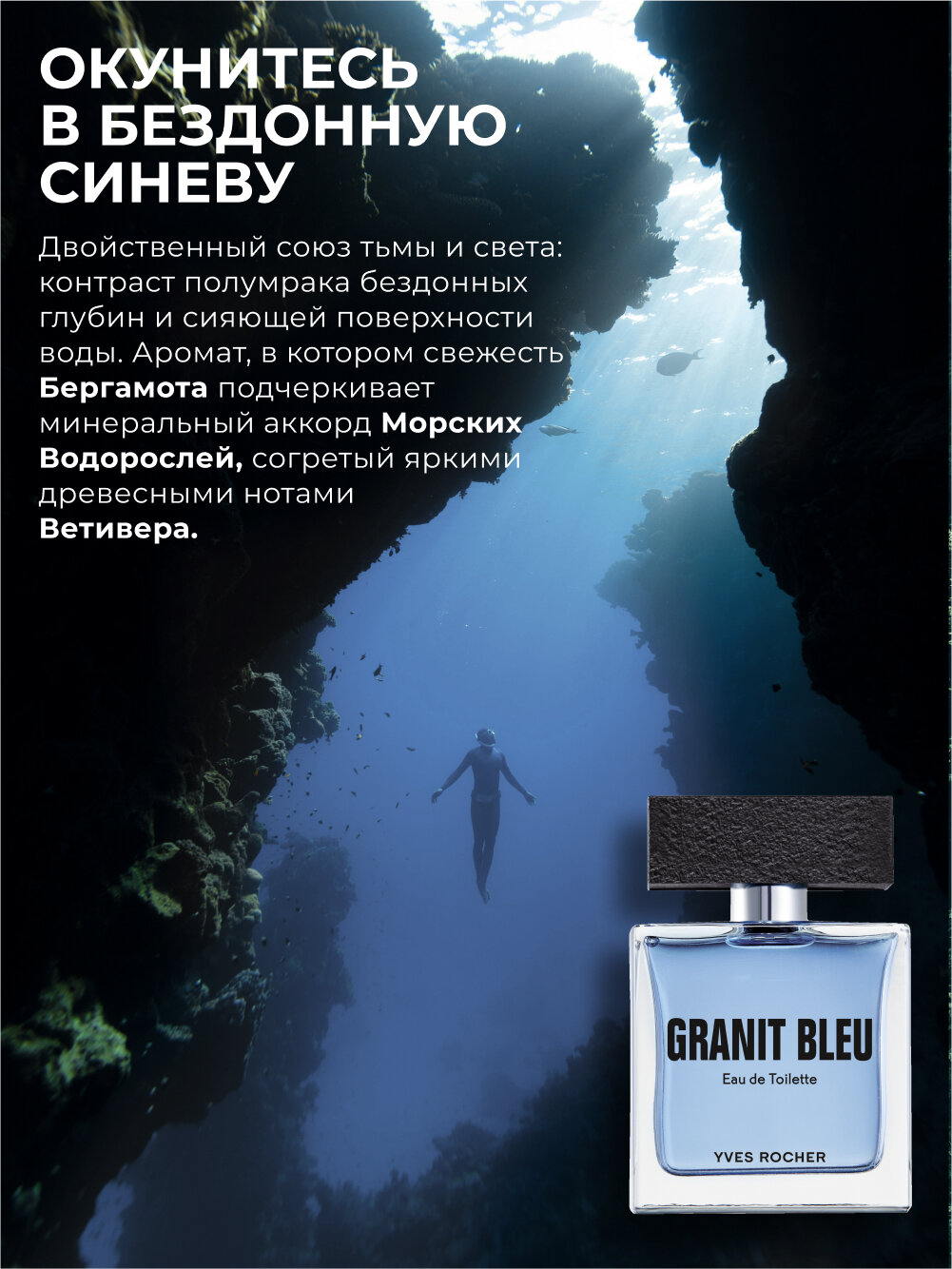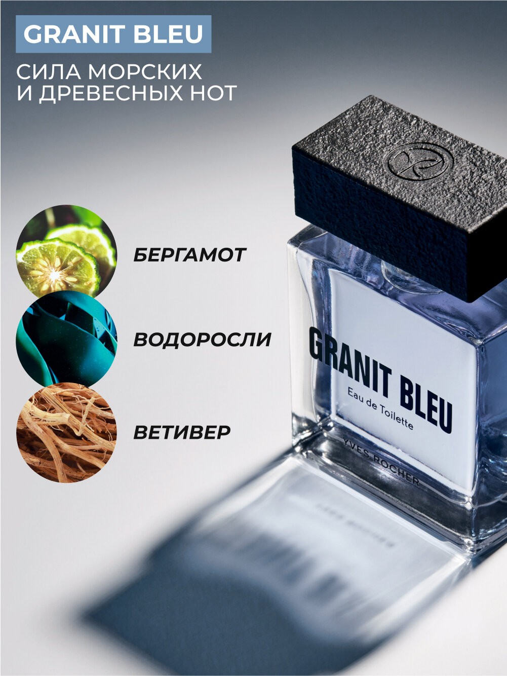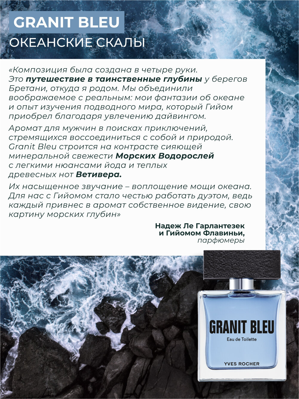 Сила морских и древесных нот В Туалетной Воде Granit Bleu – двойственный союз тьмы и света: контраст полумрака бездонных глубин и сияющей поверхности воды. Аромат, в котором свежесть Бергамота подчеркивает минеральный аккорд Морских Водорослей, согретый яркими древесными нотами Ветивера. «Композиция была создана в четыре руки. Это путешествие в таинственные глубины у берегов Бретани, откуда я родом. Мы объединили воображаемое с реальным: мои фантазии об океане и опыт изучения подводного мира, который Гийом приобрел благодаря увлечению дайвингом. Аромат для мужчин в поисках приключений, стремящихся воссоединиться с собой и природой. Granit Bleu строится на контрасте сияющей минеральной свежести Морских Водорослей с легкими нюансами йода и теплых древесных нот Ветивера. Их насыщенное звучание – воплощение мощи океана. Для нас с Гийомом стало честью работать дуэтом, ведь каждый привнес в аромат собственное видение, свою картину морских глубин».