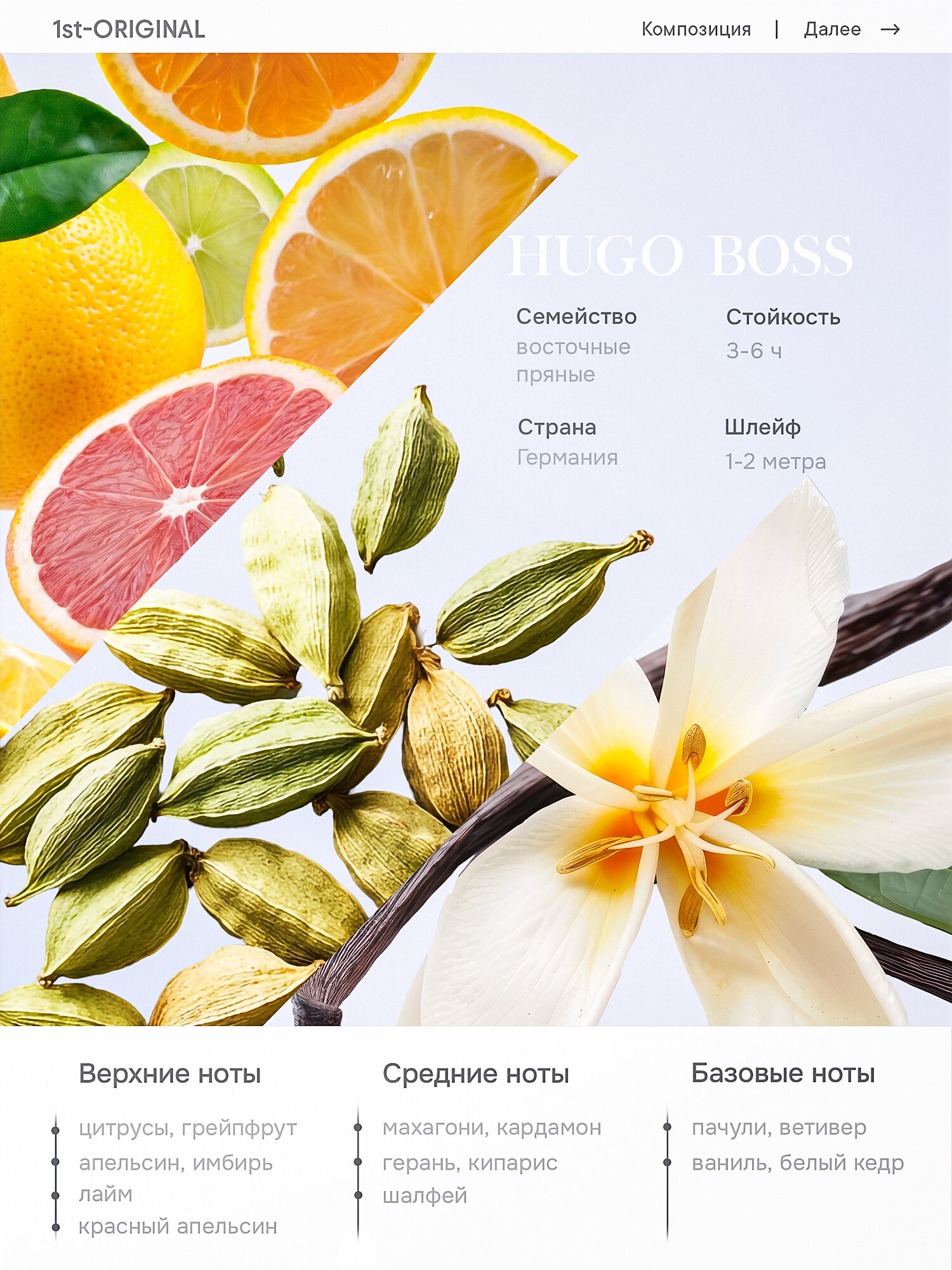 Базовые ноты: Белый кедр, пачули, Ветивер, Ваниль, Бензоин
