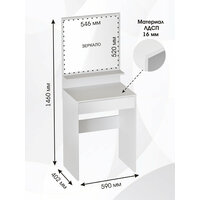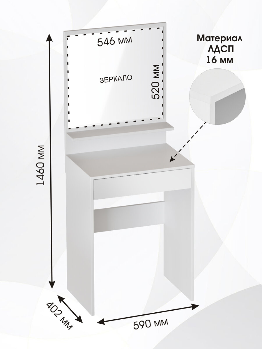 Квадратная форма столешницы размером 59.0 на 40.2 см и высотой 146.0 см обеспечивает достаточно места для размещения косметики и аксессуаров. Толщина столешницы составляет 1.6 см, что гарантирует прочность и долговечность изделия.