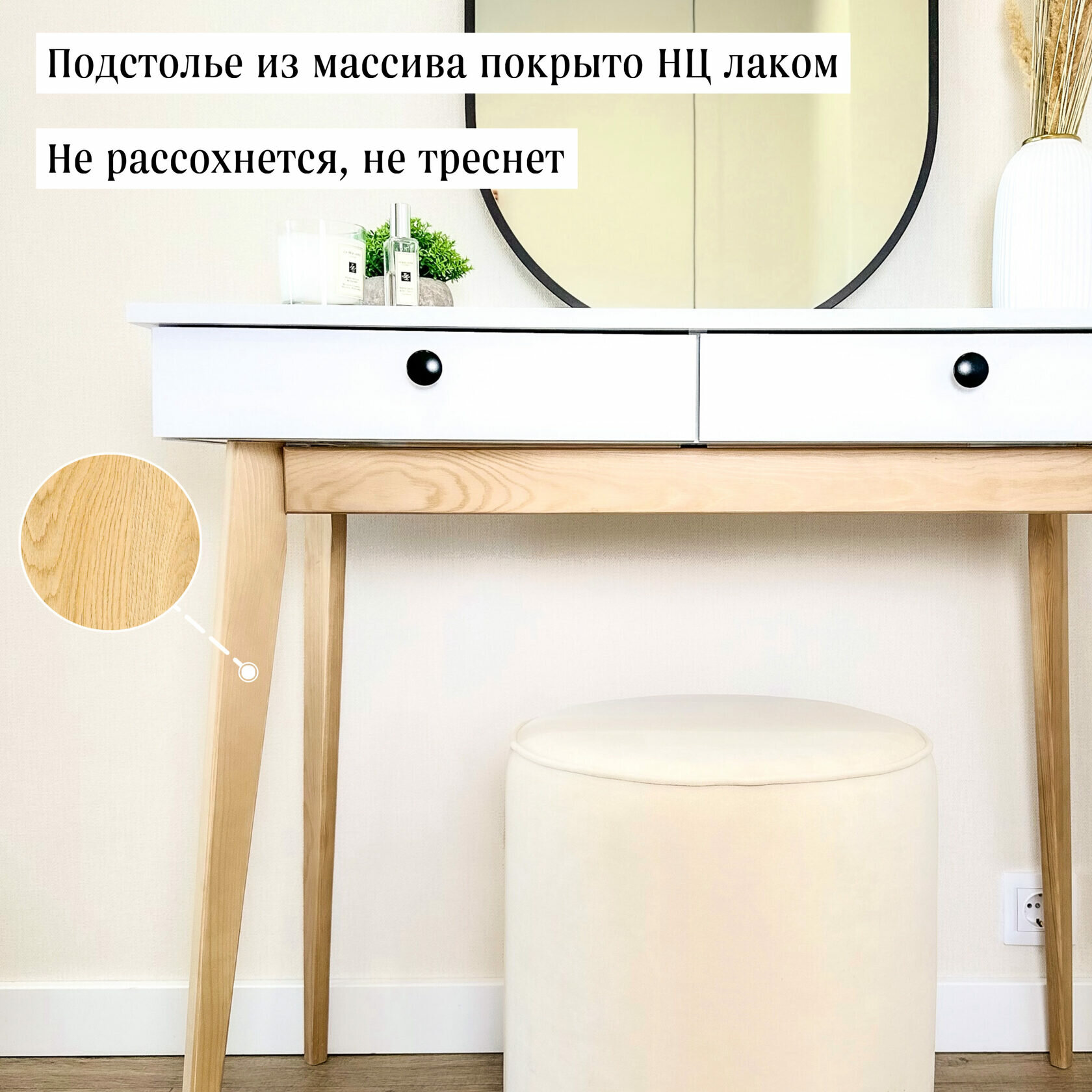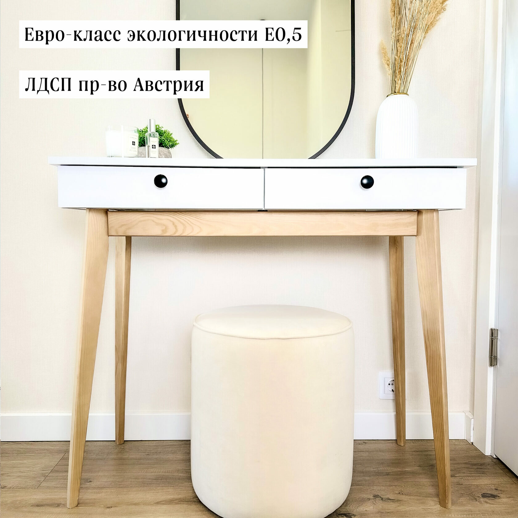 Туалетный столик Адель — это стильное и универсальное решение для обустройства любого жилого пространства. Деревянная конструкция в скандинавском стиле сочетает в себе элегантность и практичность, а тёплый белый цвет корпуса гармонично вписывается в современный интерьер.
