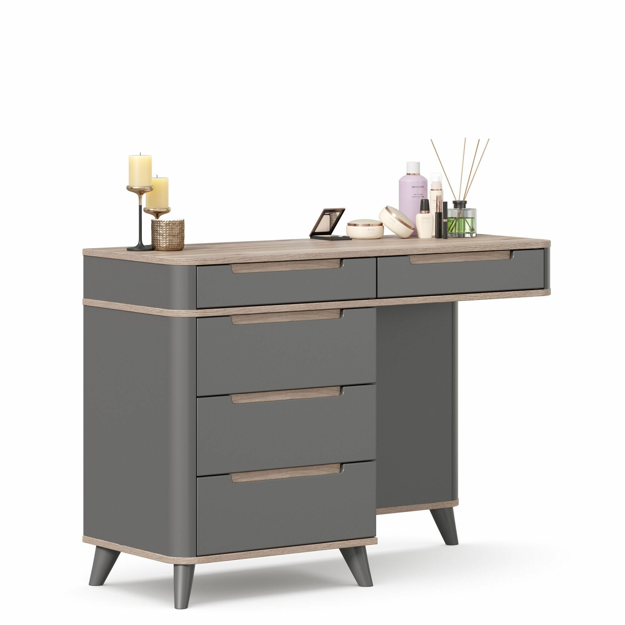 Туалетный столик Стефания. Стол туалетный Стефания это прекрасный выбор. Он незаменим в спальне или для детской, для девочки подростка или в подарок. Столик туалетный может использоваться как стол письменный, стол компьютерный, стол для учёбы или комод . Благодаря нашему столику вы сможете создать интерьер о котором мечтали. Теплой и уютной делает спальню сочетание двух текстур: древесная и оникс серый. Особый вид в стиле Ретро создают опоры ППУ.