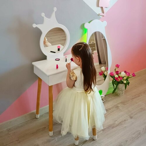 Туалетный столик с зеркалом уголок красоты в скандинавском стиле — очень важный для представительниц прекрасного пола предмет мебели. Подросткам и взрослым дамам он позволяет всегда выглядеть привлекательно. Маленьким девочкам такой гримерный стол поможет сформировать чувство прекрасного и полезную привычку следить за своим внешним видом. Туалетный столик для девочки может быть вполне удобным и в творческом применении: малышка до самой школы сможет за ним рисовать, лепить, это позволит сэкономить пространство детской комнаты. Выдвижной ящик на качественной фурнитуре туалетного столика вполне может служить местом для хранения небольших по размеру игрушек, резинок для волос и расчесок, лент, бус и прочих девичьих мелочей. Сам столик украсит комнату ребенка и дополнит дизайн яркой изюминкой. Материал: мдф, массив березы , акриловая гипоаллергенная краска и лак на водной основе . Все товары прошли обязательную сертификацию.
