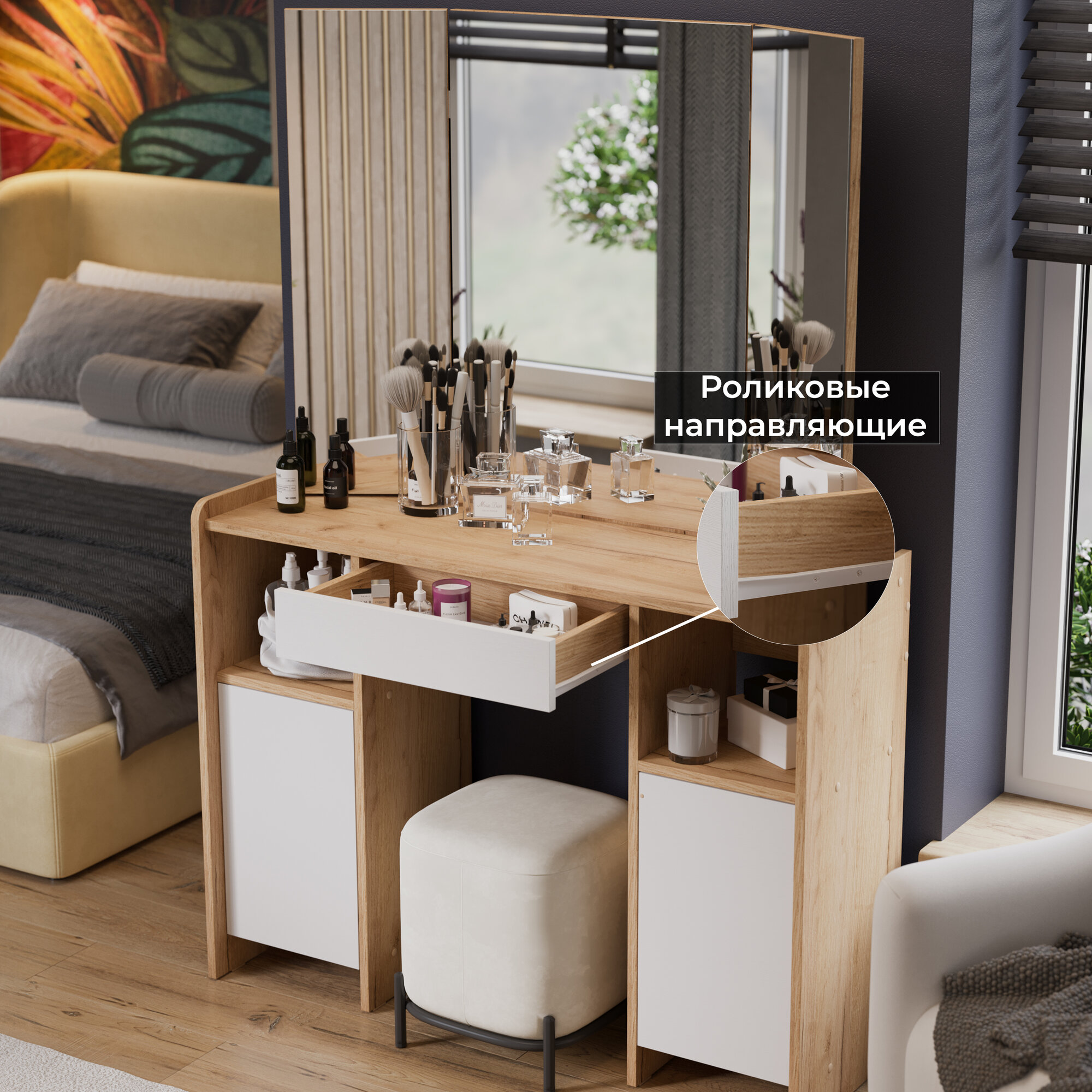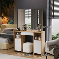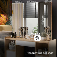 Туалетный столик оснащен зеркалом, что позволяет вам всегда быть в курсе своего внешнего вида. Также в комплекте идет полка для хранения косметики и аксессуаров, а также ящик/тумба для хранения мелких предметов.